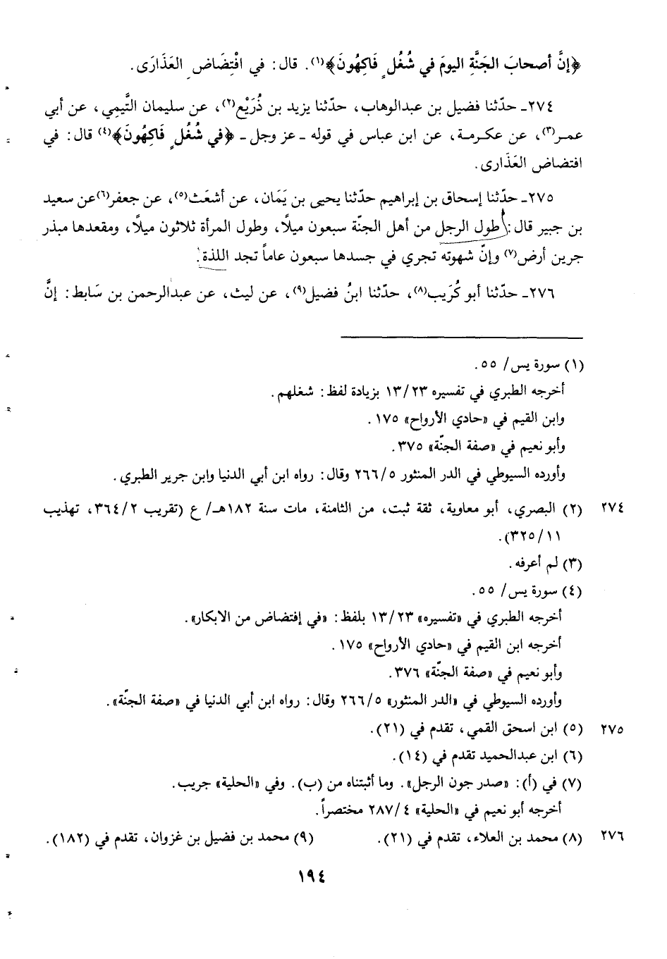 276 - حدثنا أبو كريب حدثنا ابْنُ فُضَيْلٍ عَنْ لَيْثٍ عَنْ عبد الرحمن بن سابط إِنَّ -[195]- الرَّجُلَ مِنْ أَهْلِ الْجَنَّةِ لَيَتَزَوَّجُ خَمْسَمِائَةَ حَوْرَاءَ وَأَرْبَعَةَ آلَافِ بِكْرٍ وَثَمَانِيَةَ آلَافِ ثَيِّبٍ وَمَا منهن إِلَّا يُعَانِقُهَا مِثْلَ عُمُرِ الدُّنْيَا لَا يُزَاحِمُ كُلٌّ مِنْهُمَا صَاحِبَهُ وإنه ليؤتى بغداء فما يقضي نهامته مِنْهُ مِثْلَ عُمُرِ الدُّنْيَا كُلِّهَا وَإِنَّهُ لَيُؤْتَى بِإِنَاءٍ فَيُوضَعُ فِي كَفِّهِ فَمَا يَقْضِي مِنْهُ لَذَّتَهُ عُمُرَ الدُّنْيَا كُلِّهَا.