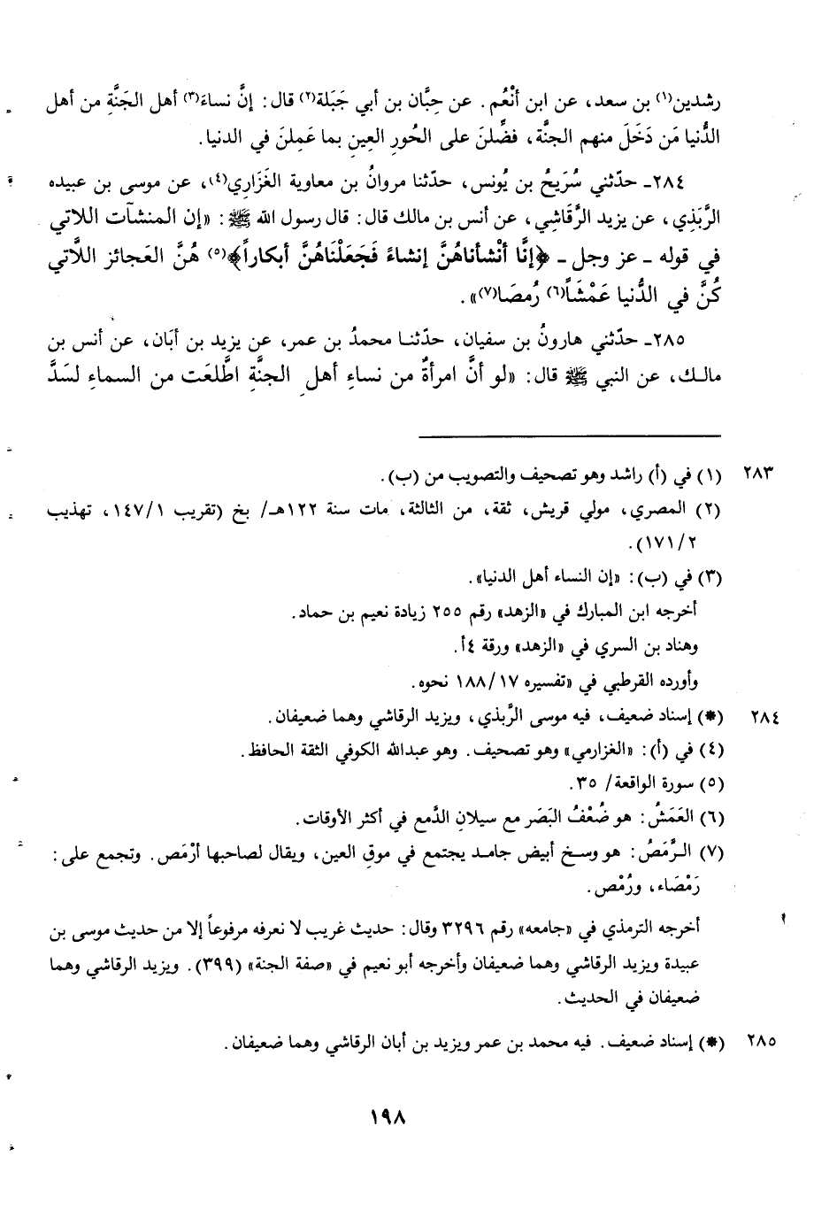 284 - حدثني سريح بن يونس حدثنا مروان بن معاوية الغزاري عَنْ مُوسَى بْنِ عُبَيْدَةَ الرَّبَذِيِّ عَنْ يَزِيدَ الرَّقَاشِيِّ عَنْ أَنَسِ بْنِ مَالِكٍ قَالَ قَالَ رَسُولُ اللَّهِ صَلَّى اللَّهُ عَلَيْهِ وَسَلَّمَ إن المنشآت اللاتي فِي قَوْلِهِ عَزَّ وَجَلَّ {إِنَّا أنشأناهن إنشاء فجعلناهن أبكارا} هُنَّ الْعَجَائِزُ اللَّاتِي كُنَّ فِي الدُّنْيَا عُمْشًا رُمْصًا.