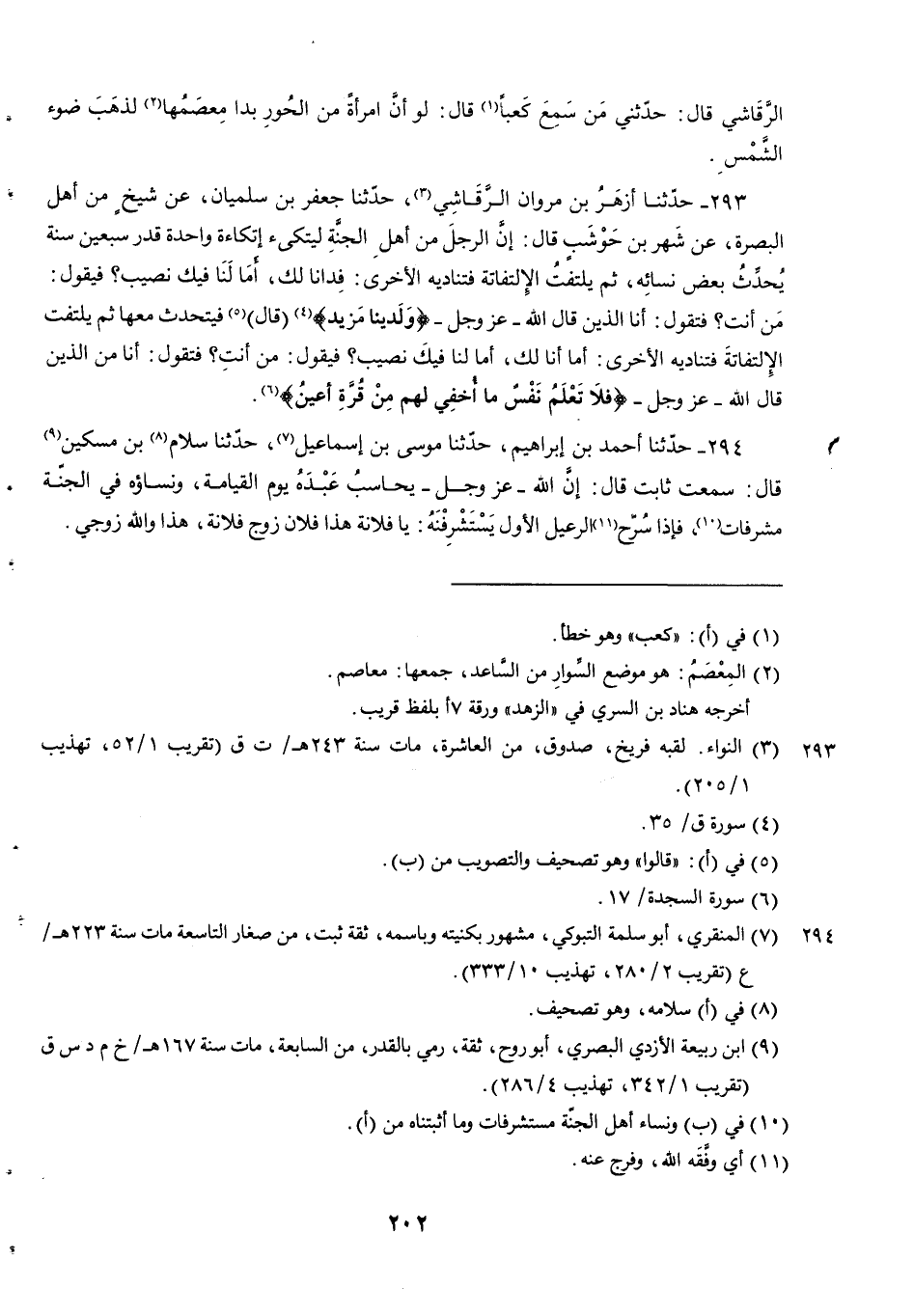 293 - حَدَّثَنَا أَزْهَرُ بْنُ مَرْوَانَ الرَّقَاشِيُّ حدثنا جَعْفَرُ بْنُ سُلَيْمَانَ عَنْ شَيْخٍ مِنْ أَهْلِ الْبَصْرَةِ عَنْ شَهْرِ بْنِ حَوْشَبٍ قَالَ إِنَّ الرَّجُلَ مِنْ أَهْلِ الْجَنَّةِ لَيَتَّكِئُ اتِّكَاءَةً وَاحِدَةً قَدْرَ سَبْعِينَ سَنَةً يُحَدِّثُ بَعْضَ نِسَائِهِ ثُمَّ يَلْتَفِتُ الِالْتِفَاتَةَ فَتُنَادِيهِ الْأُخْرَى فِدَانَا لَكَ أَمَا لَنَا فِيكَ نَصِيبٌ فَيَقُولُ مَنْ أنت فتقول أنا الَّذِينَ قَالَ اللَّهُ عَزَّ وَجَلَّ {ولدينا مزيد} قال فيتحدث معها ثُمَّ يَلْتَفِتُ الِالْتِفَاتَةَ فَتُنَادِيهِ الْأُخْرَى أَمَا إِنَّا لَكَ أَمَا لَنَا فِيكَ نَصِيبٌ فَيَقُولُ مَنْ أَنْتِ فَتَقُولُ أَنَا مِنَ الَّذِينَ قَالَ اللَّهِ عَزَّ وَجَلَّ {فَلَا تَعْلَمُ نَفْسٌ مَا أُخْفِيَ لَهُمْ مِنْ قرة أعين}.