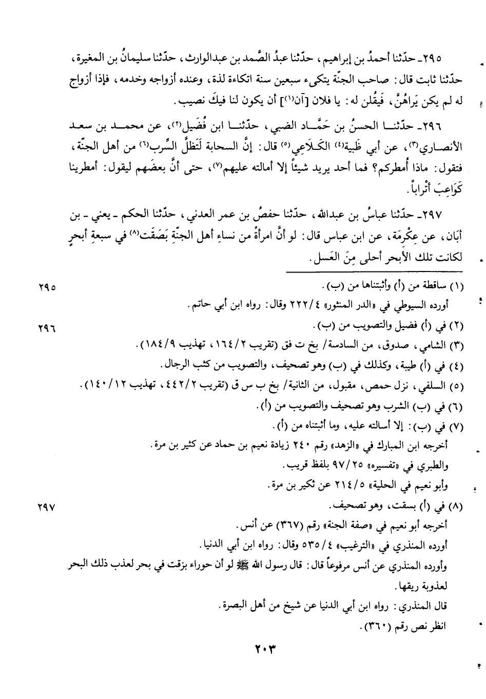 295 - حدثنا أحمد بن إبراهيم حَدَّثَنَا عَبْدُ الصَّمَدِ بْنُ عَبْدِ الوارث حدثنا سليمان بن المغيرة حدثنا ثَابِتٌ قَالَ صَاحِبُ الْجَنَّةِ يَتَّكِئُ سبعين سنة اتكاءة لذة وعنده أَزْوَاجِهِ وَخَدَمِهِ فَإِذَا أَزْوَاجٌ لَهُ لَمْ يَكُنْ يَرَاهُنَّ فَيَقُلْنَ لَهُ يا فلان آن أَنْ يَكُونَ لَنَا فِيكَ نَصِيبٌ.