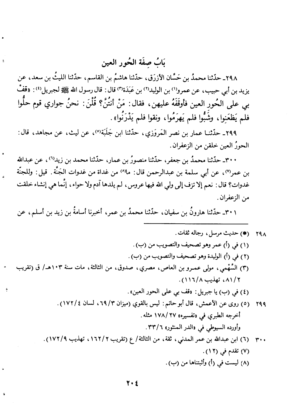 298 - حَدَّثَنَا محمد بن حسان الأزرق حدثنا هاشم بن القاسم حدثنا اللَّيْثُ بْنُ سَعْدٍ عَنْ يَزِيدَ بن أبي حبيب عن عمرو بن الْوَلِيدِ بْنِ عَبْدَةَ قَالَ قَالَ رَسُولَ اللَّهِ صَلَّى اللَّهُ عَلَيْهِ وسلم لجبريل قِفْ بِي عَلَى الْحُورِ الْعِينِ فَأَوْقَفَهُ عَلَيْهِنَّ فَقَالَ مَنْ أَنْتُنَّ قُلْنَ نَحْنُ جَوَارِي قَوْمٍ حَلُّوا فَلَمْ يَظْعَنُوا وَشَبُّوا فَلَمْ يَهْرَمُوا وَنُقُّوا فَلَمْ يَدْرَنُوا.