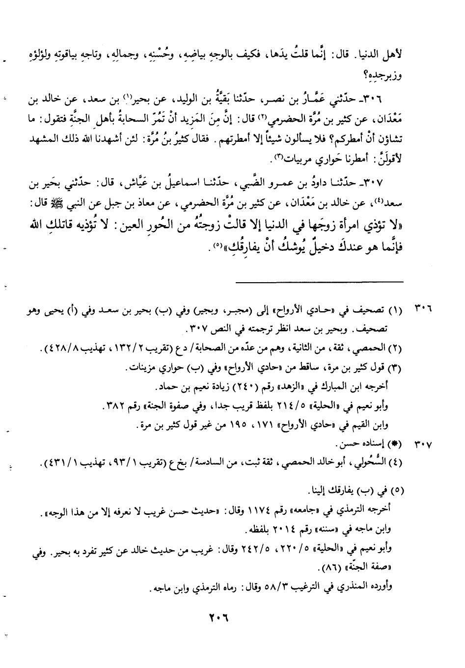306 - حدثني عمار بن نصر حدثنا بقية بن الوليد عَنْ بُحَيْرِ بْنِ سَعْدٍ عَنْ خَالِدِ بْنِ مَعْدَانَ عَنْ كَثِيرِ بْنِ مُرَّةَ الْحَضْرَمِيِّ قَالَ إِنَّ مِنَ الْمَزِيدِ أَنْ تَمُرَّ السَّحَابَةُ بأهل الجنة فتقول ما تشاؤن أَنْ أُمْطِرَكُمْ فَلَا يَسْأَلُونَ شَيْئًا إلا أمطرتهم. فَقَالَ كَثِيرُ بْنُ مُرَّةَ لَئِنْ أَشْهَدَنَا اللَّهُ ذَلِكَ الْمَشْهَدَ لَأَقُولَنَّ أمطرنا حواري مربيات.
