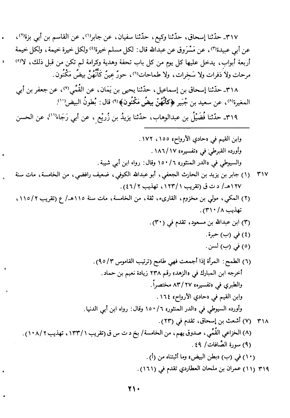 318 - حَدَّثَنَا إِسْحَاقُ بْنُ إِسْمَاعِيلَ حَدَّثَنَا يَحْيَى بْنُ يَمَانٍ عَنِ الْقُمِّيِّ عَنْ جَعْفَرِ بْنِ أَبِي الْمُغِيرَةِ عَنْ سَعِيدِ بْنِ جُبَيْرٍ {كَأَنَّهُنَّ بيض مكنون} قَالَ بُطُونُ الْبَيْضِ.