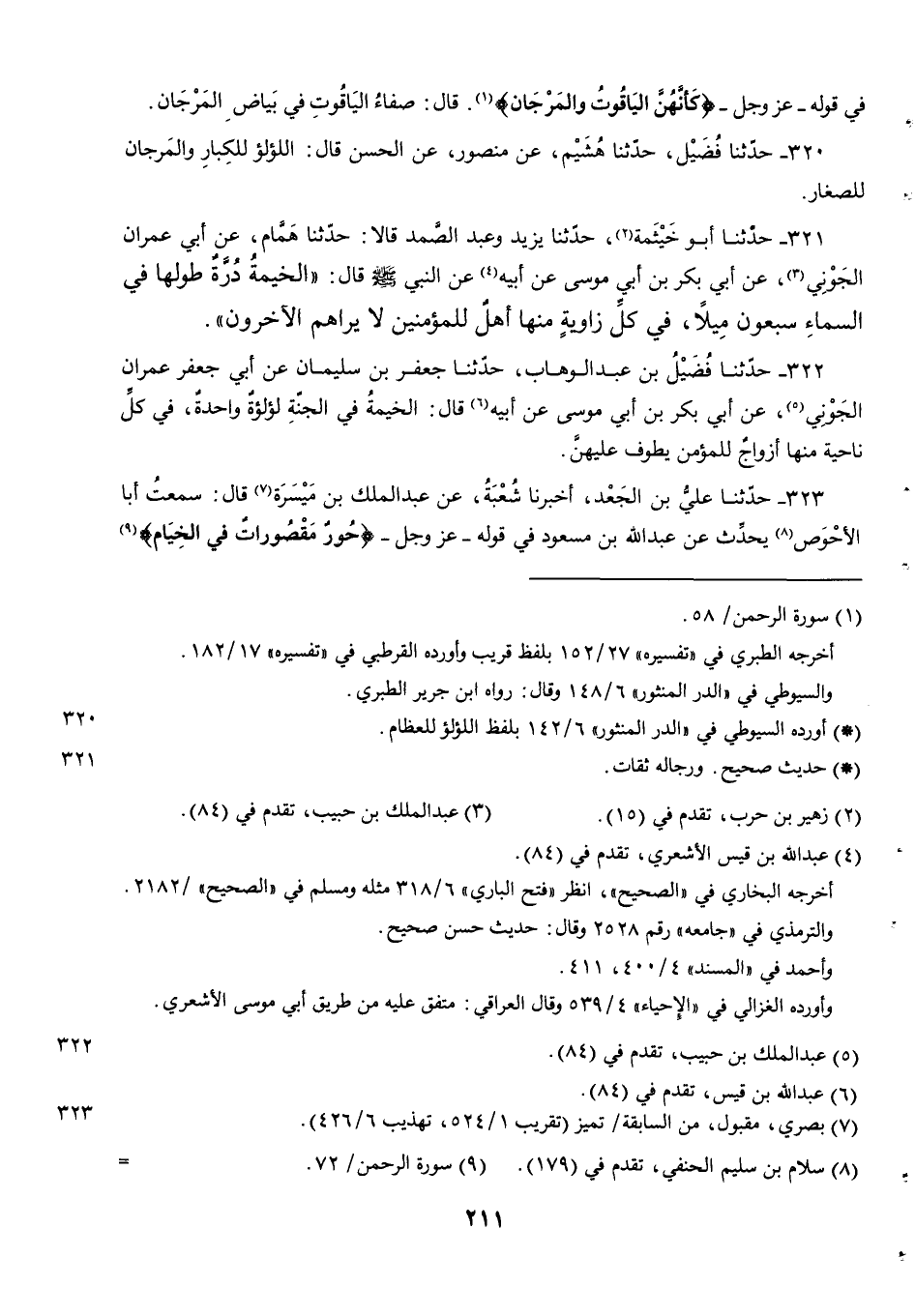 320 - حدثنا فضيل حدثنا هُشَيْمٌ عَنْ مَنْصُورٍ عَنِ الْحَسَنِ قال اللؤلؤ للكبار والمرجان للصغار.