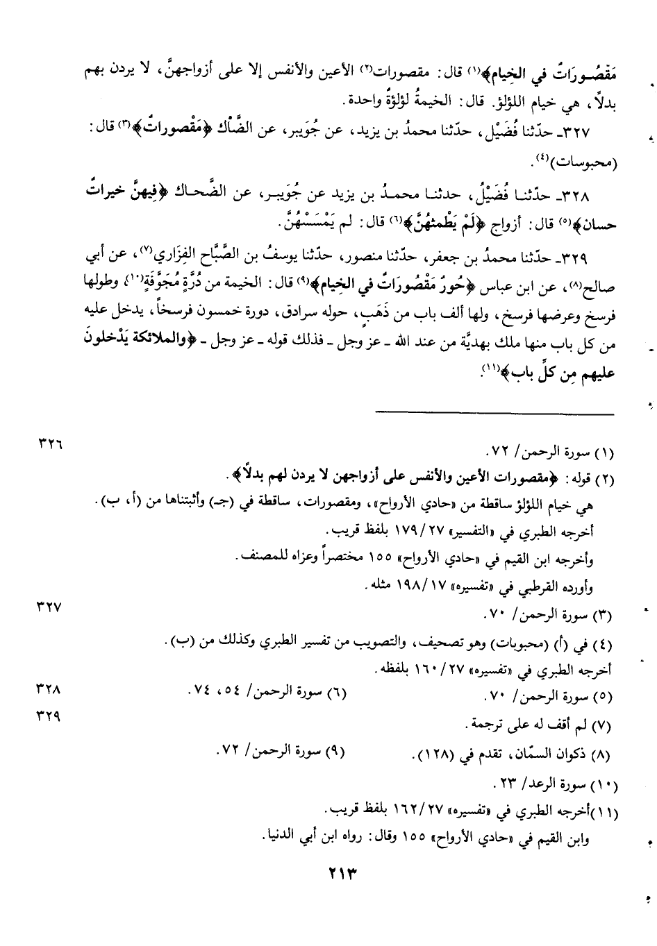 329 - حدثنا محمد بن جعفر حدثنا منصور حدثنا يُوسُفُ بْنُ الصَّبَّاحِ الْفَزَارِيُّ عَنْ أَبِي صَالِحٍ عَنِ ابْنِ عَبَّاسٍ {حور مقصورات في الخيام} قَالَ الْخَيْمَةُ مِنْ دُرَّةٍ مُجَوَّفَةٍ وطولها فرسخ وعرضهافرسخ وَلَهَا أَلْفُ بَابٍ مِنْ ذَهَبٍ حَوْلَهُ سُرَادِقٌ دَوْرُهُ خَمْسُونَ فَرْسَخًا يَدْخُلُ عَلَيْهِ مِنْ كُلِّ بَابٍ مِنْهَا مَلَكٌ بِهَدِيَّةٍ مِنْ عِنْدِ اللَّهِ عَزَّ وَجَلَّ فَذَلِكَ قَوْلُهُ عَزَّ وَجَلَّ {وَالْمَلَائِكَةُ يَدْخُلُونَ عَلَيْهِمْ من كل باب}.