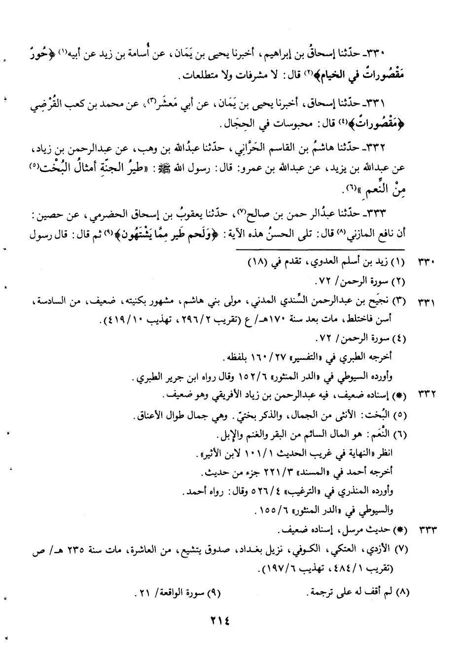330 - حدثنا إسحاق بن إبراهيم أخبرنا يحيى بن يمان عن أُسَامَةُ بْنُ زَيْدٍ عَنْ أَبِيهِ {حور مقصورات في الخيام} قال لا مشرفات ولا متطلعات.