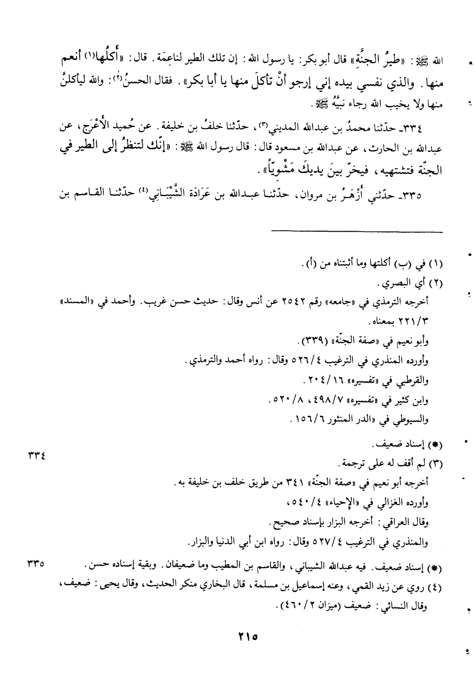 334 - حَدَّثَنَا مُحَمَّدُ بْنُ عَبْدِ اللَّهِ المديني حدثنا خَلَفُ بْنُ خَلِيفَةَ. عَنْ حُمَيْدٍ الْأَعْرَجُ عَنْ عَبْدِ اللهِ بْنِ الْحَارِثِ عَنْ عَبْدِ اللَّهِ بْنِ مَسْعُودٍ قَالَ قَالَ رَسُولُ اللَّهِ صَلَّى اللَّهُ عَلَيْهِ وَسَلَّمَ إِنَّكَ لَتَنْظُرُ إِلَى الطَّيْرِ فِي الْجَنَّةِ فَتَشْتَهِيهِ فَيَخِرُّ بَيْنَ يَدَيْكَ مَشْوِيًّا.