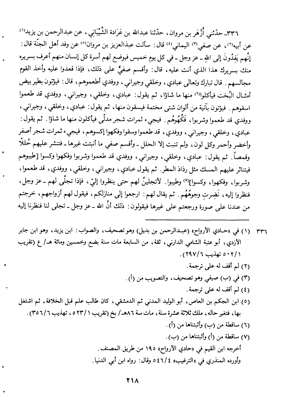 336 - حدثني أزهر بن مروان حدثنا عَبْدُ اللَّهِ بْنُ عَرَادَةَ الشَّيْبَانِيُّ عَنْ عَبْدِ الرَّحْمَنِ بْنِ يَزِيدَ عن أبيه عن صفي الْيَمَانِيِّ قَالَ سَأَلْتُ عَبْدَ الْعَزِيزِ بن مروان عن وافد أَهْلِ الْجَنَّةِ قَالَ إِنَّهُمْ يَفِدُونَ إِلَى اللَّهِ عَزَّ وَجَلَّ فِي كُلِّ يَوْمِ خَمِيسٍ فَيُوضَعُ لَهُمْ أَسِرَّةٌ كُلُّ إِنْسَانٍ مِنْهُمْ أَعْرَفُ بِسَرِيرِهِ مِنْكَ بِسَرِيرِكَ هَذَا الَّذِي أنت عليه قال وأقسم صفي عَلَى ذَلِكَ فَإِذَا قَعَدُوا عَلَيْهِ وَأَخَذَ الْقَوْمُ مَجَالِسَهُمْ. قَالَ تَبَارَكَ وتعالى عِبَادِي وَخَلْقِي وَجِيرَانِي وَوَفْدِي أَطْعِمُوهُمْ قَالَ فَيُؤْتَوْنَ بِطَيْرٍ بِيضٍ أَمْثَالِ البخت فيأكلوا منها ما شاؤا ثُمَّ يَقُولُ عِبَادِي وَخَلْقِي وَجِيرَانِي وَوَفْدِي قَدْ طَعِمُوا اسْقُوهُمْ. فَيُؤْتَوْنَ بِآنِيَةٍ مِنْ أَلْوَانٍ شَتَّى مُخَتَّمَةً فَيُسْقَوْنَ مِنْهَا ثُمَّ يَقُولُ عِبَادِي وَخَلْقِي وَجِيرَانِي وَوَفْدِي قَدْ طَعِمُوا وَشَرِبُوا فَكِّهُوهُمْ. فَيَجِيءُ ثَمَرَاتُ شَجَرٍ مدلى فيأكلون منها ما شاؤا.
