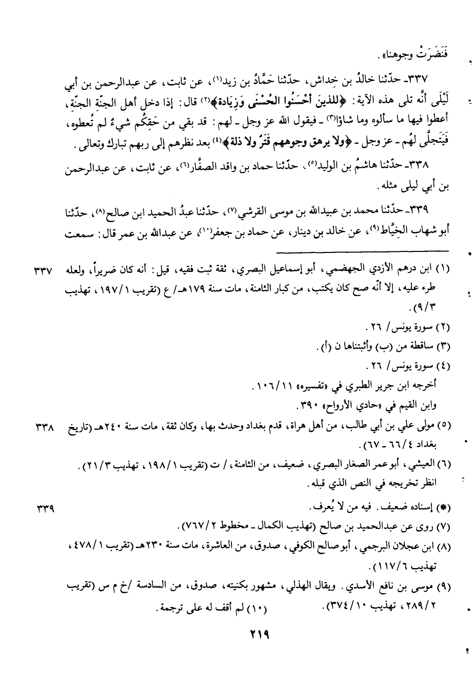 337 - حدثنا خالد بن خداش حدثنا حَمَّادُ بْنُ زَيْدٍ عَنْ ثَابِتٍ عَنْ عَبْدِ الرَّحْمَنِ بْنِ أَبِي ليلى أنه تلى هَذِهِ الْآيَةَ {لِلَّذِينَ أَحْسَنُوا الْحُسْنَى وزيادة} قَالَ إِذَا دَخَلَ أَهْلُ الْجَنَّةِ الْجَنَّةَ أُعْطُوا فِيهَا مَا سَأَلُوهُ وما شاؤا فَيَقُولُ اللَّهُ عَزَّ وَجَلَّ لَهُمْ قد بقي من حقكم شيء لَمْ تُعْطَوْهُ فَيَتَجَلَّى لَهُمْ عَزَّ وَجَلَّ {وَلَا يَرْهَقُ وُجُوهَهُمْ قَتَرٌ ولا ذلة} بعد نظرهم إلى ربهم تبارك وتعالى.