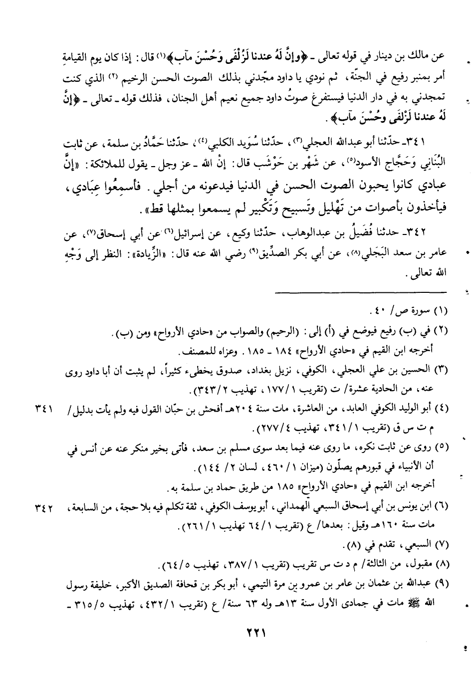 341 - حَدَّثَنَا أَبُو عَبْدِ اللَّهِ الْعِجْلِيُّ حدثنا سويد الكلبي حدثنا حَمَّادُ بْنُ سَلَمَةَ عَنْ ثَابِتٍ الْبُنَانِيِّ وَحَجَّاجٍ الْأَسْوَدِ عَنْ شَهْرِ بْنِ حَوْشَبٍ قَالَ إِنَّ اللَّهَ عَزَّ وَجَلَّ يَقُولُ لِلْمَلَائِكَةِ إِنَّ عِبَادِي كَانُوا يُحِبُّونَ الصَّوْتَ الْحَسَنَ فِي الدُّنْيَا فَيَدَعُونَهُ مِنْ أَجْلِي. فَأَسْمِعُوا عِبَادِي فَيَأْخُذُونَ بِأَصْوَاتٍ مِنْ تَهْلِيلٍ وَتَسْبِيحٍ وَتَكْبِيرٍ لَمْ يَسْمَعُوا بِمِثْلِهَا قَطُّ.