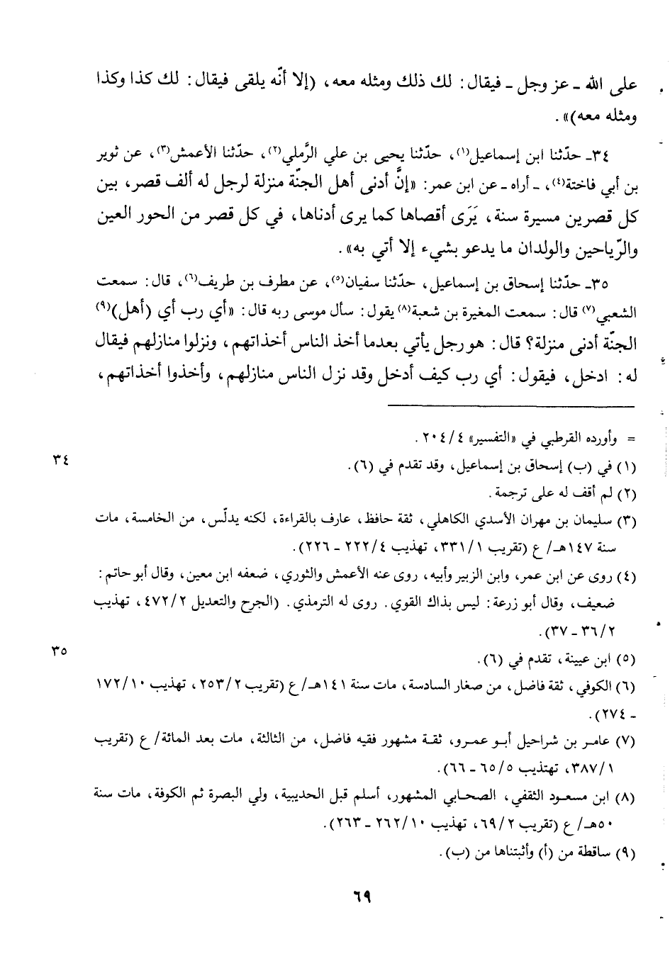 34 - حدثنا ابن إسماعيل حدثنا يحيى بن علي الرملي حدثنا الْأَعْمَشُ عَنْ ثُوَيْرِ بْنِ أَبِي فَاخِتَةَ أُرَاهُ عَنِ ابْنِ عُمَرَ إِنَّ أَدْنَى أَهْلِ الْجَنَّةِ مَنْزِلَةً لَرَجُلٌ لَهُ أَلْفُ قَصْرٍ بَيْنَ كُلِّ قَصْرَيْنِ مَسِيرَةُ سَنَةٍ يُرَى أَقْصَاهَا كَمَا يُرَى أَدْنَاهَا فِي كُلِّ قَصْرٍ مِنَ الْحُورِ الْعِينِ وَالرَّيَاحِينِ وَالْوِلْدَانِ مَا يَدْعُو بِشَيْءٍ إِلَّا أُتِيَ بِهِ.
