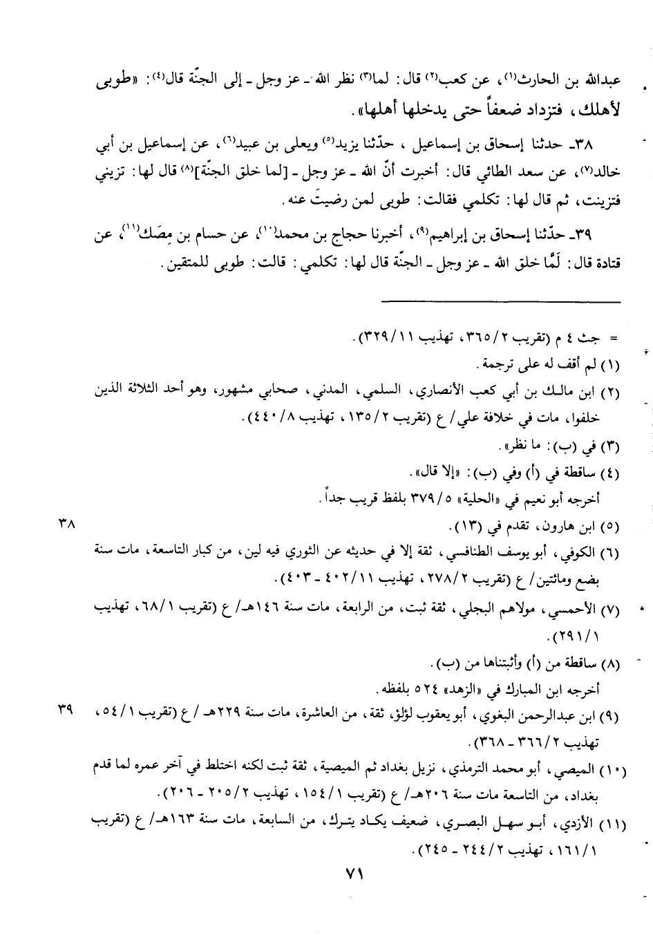 39 - حَدَّثَنَا إسحاق بن إبراهيم أخبرنا حَجَّاجُ بْنُ مُحَمَّدٍ عَنْ حُسَامِ بْنِ مِصَكٍّ عَنْ قَتَادَةَ قَالَ لَمَّا خَلَقَ اللَّهُ عَزَّ وَجَلَّ الْجَنَّةَ قَالَ لَهَا تَكَلَّمِي قَالَتْ طُوبَى لِلْمُتَّقِينَ.