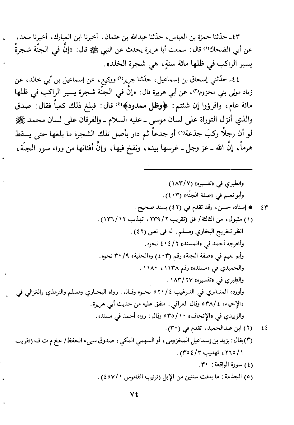 44 - حدثني إِسْحَاقُ بْنُ إِسْمَاعِيلَ حَدَّثَنَا جَرِيرٌ وَوَكِيعٌ عَنْ إِسْمَاعِيلَ بْنِ أَبِي خَالِدٍ عَنْ زِيَادٍ مَوْلَى بَنِي مَخْزُومٍ عَنْ أَبِي هُرَيْرَةَ قَالَ إِنَّ فِي الْجَنَّةِ شَجَرَةً يَسِيرُ الرَّاكِبُ فِي ظِلِّهَا مِائَةَ عَامٍ واقرؤوا إن شئتم {وظل ممدود} قَالَ فَبَلَغَ ذَلِكَ كَعْبًا فَقَالَ صَدَقَ وَالَّذِي أَنْزَلَ التَّوْرَاةَ عَلَى لِسَانِ مُوسَى عَلَيْهِ السَّلَامُ وَالْفُرْقَانَ عَلَى لِسَانِ مُحَمَّدٍ صَلَّى اللَّهُ عَلَيْهِ وَسَلَّمَ لَوْ أَنَّ رَجُلًا ركب جذعة أو جدعا ثُمَّ دَارَ بِأَصْلِ تِلْكَ الشَّجَرَةِ مَا بَلَغَهَا حَتَّى يَسْقُطَ هَرِمًا إِنَّ اللَّهَ عَزَّ وَجَلَّ غَرَسَهَا بِيَدِهِ وَنَفَخَ فِيهَا وَإِنَّ أَفْنَانَهَا مِنْ وَرَاءِ سُورِ الْجَنَّةِ -[75]- مَا فِي الْجَنَّةِ نَهَرٌ إِلَّا وَهُوَ يَخْرُجُ مِنْ أَصْلِ تِلْكَ الشَّجَرَةِ.