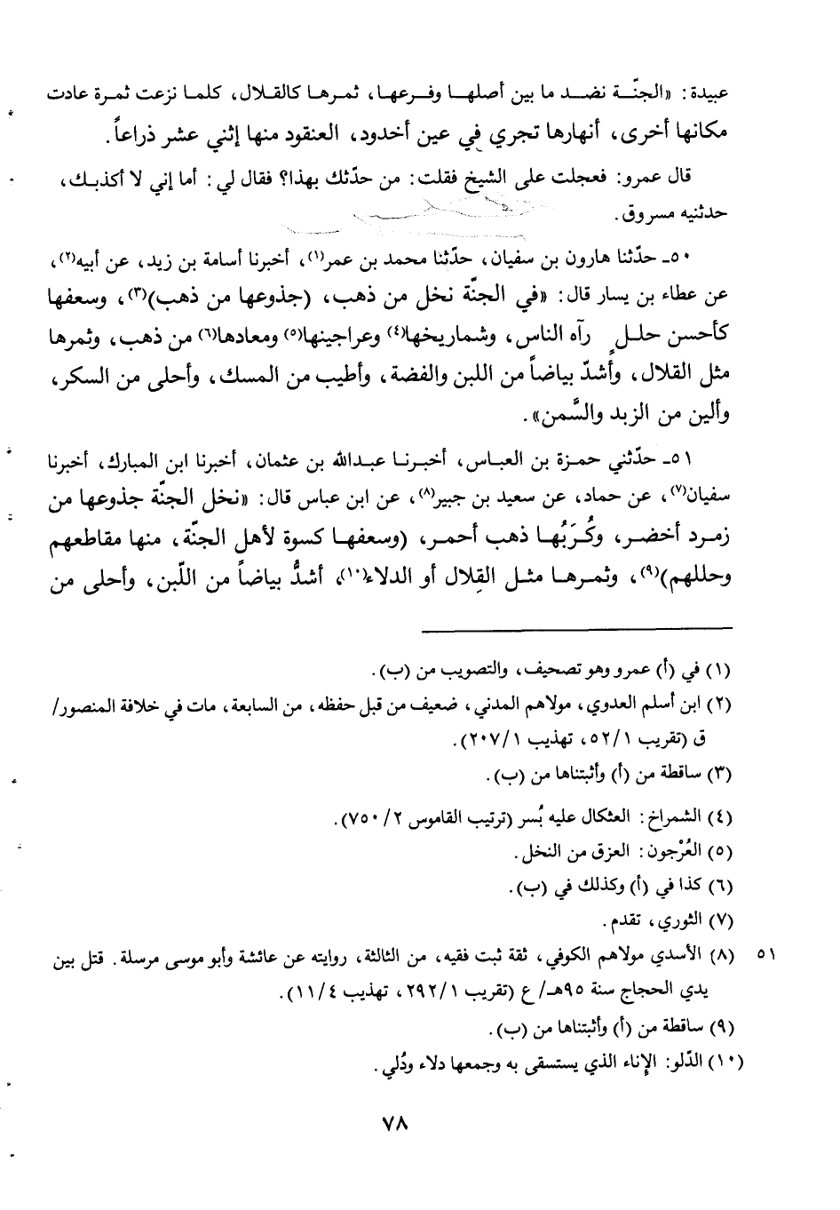 51 - حدثني حَمْزَةُ بْنُ الْعَبَّاسِ أَخْبَرَنَا عَبْدُ الله بن عثمان أخبرنا ابن المبارك أخبرنا سُفْيَانُ عَنْ حَمَّادٍ عَنْ سَعِيدِ بْنِ جُبَيْرٍ عَنِ ابْنِ عَبَّاسٍ قَالَ نَخْلُ الْجَنَّةِ جُذُوعُهَا مِنْ زمرد أخضر وكربها ذهب أحمر وسعفها كسوة لأهل الجنة منها مقاطعهم وحللهم وثمرها مثل القلال أو الدلاء أَشَدُّ بَيَاضًا مِنَ اللَّبَنِ وَأَحْلَى مِنَ -[79]- الْعَسَلِ وَأَلْيَنُ مِنَ الزُّبْدِ ليس فيها عُجْمٌ.
