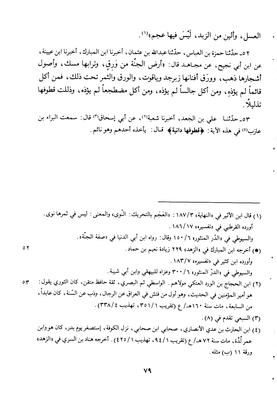 53 - حدثنا علي بن الجعد أخبرنا شُعْبَةُ عَنْ أَبِي إِسْحَاقَ قَالَ سَمِعْتُ الْبَرَاءَ بْنَ عَازِبٍ فِي هذه الآية {قطوفها دانية} قَالَ يَأْخُذُهُ أَحَدُهُمْ وَهُوَ نَائِمٌ.