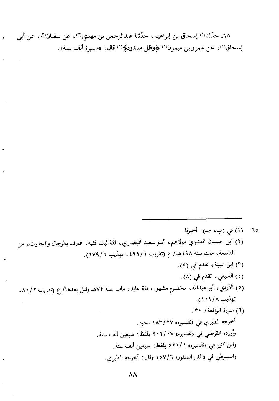 65 - حدثنا إسحاق بن إبراهيم حدثنا عَبْدُ الرَّحْمَنِ بْنُ مَهْدِيٍّ عَنْ سُفْيَانَ عَنْ أَبِي إِسْحَاقَ عَنْ عَمْرِو بْنِ مَيْمُونٍ {وَظِلٍ مَمْدُودٍ} قَالَ مَسِيرَةُ أَلْفِ سَنَةٍ.