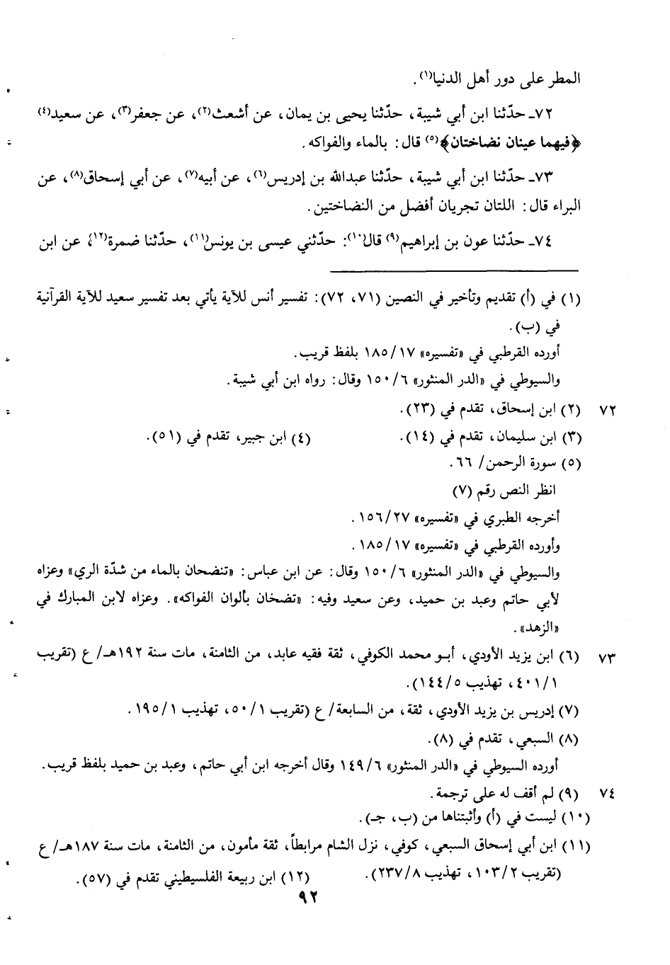 72 - حدثنا ابن أبي شيبة حدثنا يَحْيَى بْنُ يَمَانٍ عَنْ أَشْعَثَ عَنْ جَعْفَرٍ عَنْ سَعِيدٍ {فِيهِمَا عينان نضاختان} قَالَ بِالْمَاءِ وَالْفَوَاكِهِ