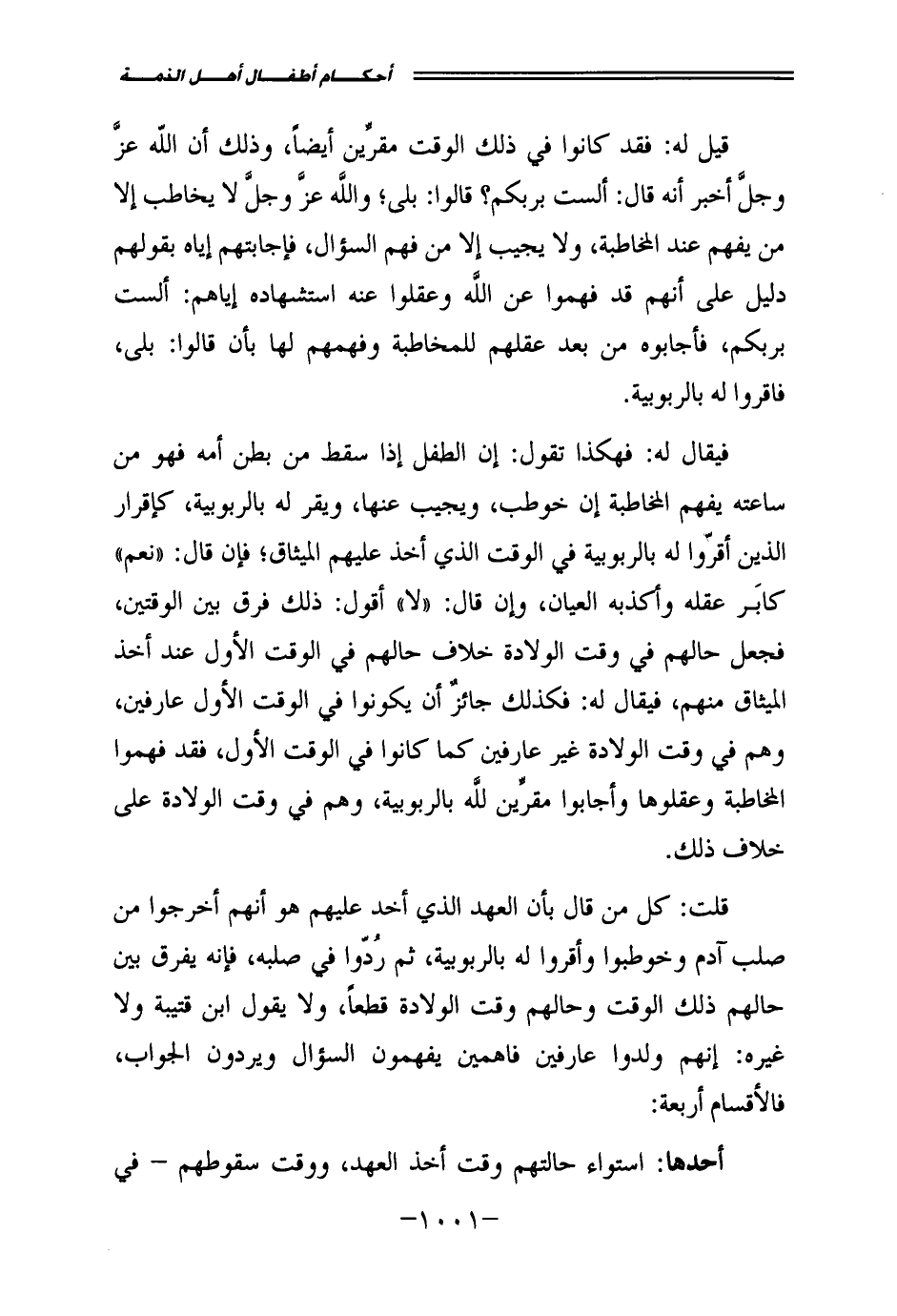 قُلْتُ: كُلُّ مَنْ قَالَ بِأَنَّ الْعَهْدَ الَّذِي أُخِذَ عَلَيْهِمْ هُوَ أَنَّهُمْ أُخْرِجُوا مِنْ صُلْبِ آدَمَ وَخُوطِبُوا، وَأَقَرُّوا لَهُ بِالرُّبُوبِيَّةِ، ثُمَّ رُدُّوا فِي صُلْبِهِ، فَإِنَّهُ يُفَرِّقُ بَيْنَ حَالِهِمْ ذَلِكَ الْوَقْتَ وَحَالِهِمْ وَقْتَ الْوِلَادَةِ قَطْعًا، وَلَا يَقُولُ ابْنُ قُتَيْبَةَ وَلَا غَيْرُهُ: إِنَّهُمْ وُلِدُوا عَارِفِينَ فَاهِمِينَ يَفْهَمُونَ السُّؤَالَ، وَيَرُدُّونَ الْجَوَابَ، فَالْأَقْسَامُ أَرْبَعَةٌ: