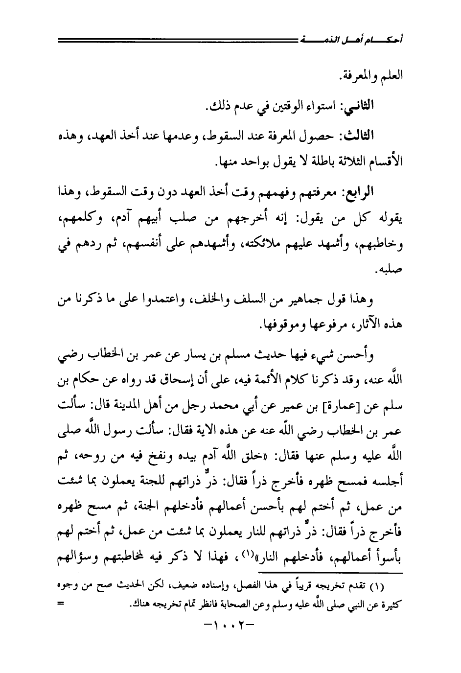 [عُمَارَةَ] بْنِ عُمَيْرٍ، عَنْ أَبِي مُحَمَّدٍ رَجُلٍ مِنْ أَهْلِ الْمَدِينَةِ قَالَ: «سَأَلْتُ عُمَرَ بْنَ الْخَطَّابِ - رَضِيَ اللَّهُ عَنْهُ - عَنْ هَذِهِ الْآيَةِ، فَقَالَ: سَأَلْتُ رَسُولَ اللَّهِ - صَلَّى اللَّهُ عَلَيْهِ وَسَلَّمَ - عَنْهَا، فَقَالَ: " خَلَقَ اللَّهُ آدَمَ بِيَدِهِ وَنَفَخَ فِيهِ مِنْ رُوحِهِ، ثُمَّ أَجْلَسَهُ فَمَسَحَ ظَهْرَهُ، فَأَخْرَجَ ذَرًّا، فَقَالَ: ذَرٌّ ذَرَّاتُهُمْ لِلْجَنَّةِ يَعْمَلُونَ بِمَا شِئْتُ مِنْ عَمَلٍ، ثُمَّ أَخْتِمُ لَهُمْ بِأَحْسَنِ أَعْمَالِهِمْ فَأُدْخِلُهُمُ الْجَنَّةَ، ثُمَّ مَسَحَ ظَهْرَهُ، فَأَخْرَجَ ذَرًّا، فَقَالَ: ذَرٌّ ذَرَّاتُهُمْ لِلنَّارِ يَعْمَلُونَ بِمَا شِئْتُ مِنْ عَمَلٍ، ثُمَّ أَخْتِمُ لَهُمْ بِأَسْوَأِ أَعْمَالِهِمْ، فَأُدْخِلُهُمُ النَّارَ» "، فَهَذَا لَا ذِكْرَ فِيهِ لِمُخَاطَبَتِهِمْ، وَسُؤَالِهِمْ