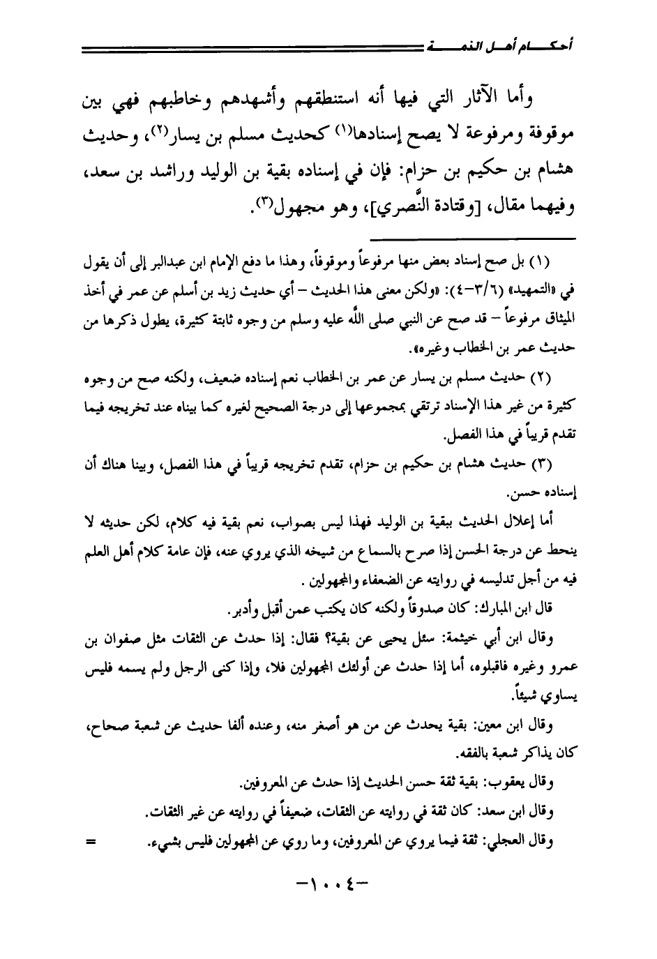 وَأَمَّا الْآثَارُ الَّتِي فِيهَا أَنَّهُ اسْتَنْطَقَهُمْ، وَأَشْهَدَهُمْ، وَخَاطَبَهُمْ فَهِيَ بَيْنَ مَوْقُوفَةٍ، وَمَرْفُوعَةٍ لَا يَصِحُّ إِسْنَادُهَا كَحَدِيثِ مُسْلِمِ بْنِ يَسَارٍ، وَحَدِيثِ هِشَامِ بْنِ حَكِيمِ بْنِ حِزَامٍ: فَإِنَّ فِي إِسْنَادِهِ بَقِيَّةُ بْنُ الْوَلِيدِ، وَرَاشِدُ بْنُ سَعْدٍ، وَفِيهِمَا مَقَالٌ،