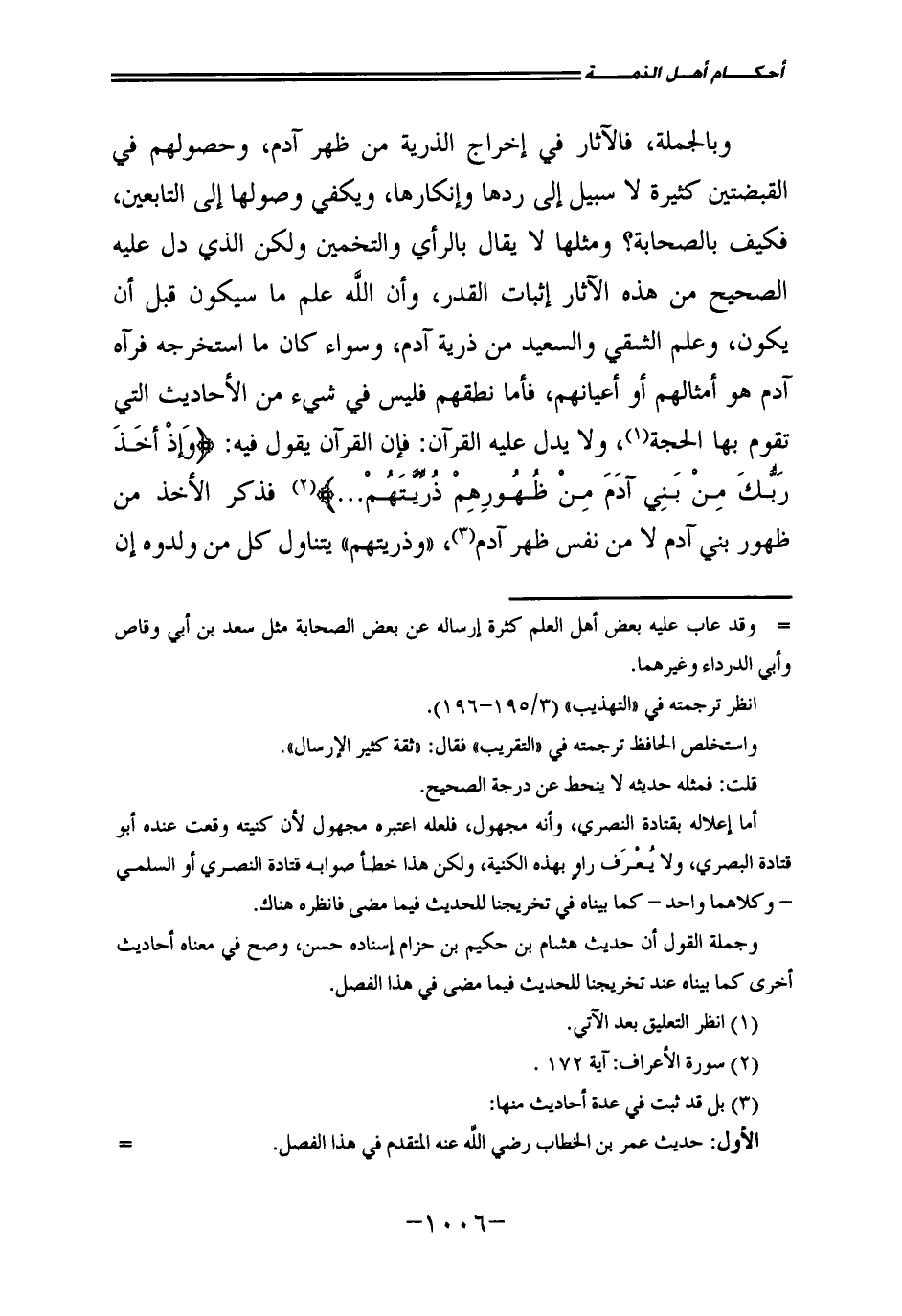 وَبِالْجُمْلَةِ، فَالْآثَارُ فِي إِخْرَاجِ الذُّرِّيَّةِ مِنْ ظَهْرِ آدَمَ، وَحُصُولِهِمْ فِي الْقَبْضَتَيْنِ كَثِيرَةٌ لَا سَبِيلَ إِلَى رَدِّهَا، وَإِنْكَارِهَا، وَيَكْفِي وُصُولُهَا إِلَى التَّابِعِينَ، فَكَيْفَ بِالصَّحَابَةِ؟ وَمِثْلُهَا لَا يُقَالُ بِالرَّأْيِ وَالتَّخْمِينِ، وَلَكِنْ الَّذِي دَلَّ عَلَيْهِ الصَّحِيحُ مِنْ هَذِهِ الْآثَارِ إِثْبَاتُ الْقَدَرِ، وَأَنَّ اللَّهَ عَلِمَ مَا سَيَكُونُ قَبْلَ أَنْ يَكُونَ، وَعَلِمَ الشَّقِيَّ وَالسَّعِيدَ مِنْ ذُرِّيَّةِ آدَمَ، وَسَوَاءٌ كَانَ مَا اسْتَخْرَجَهُ فَرَآهُ آدَمُ هُوَ أَمْثَالُهُمْ، أَوْ أَعْيَانُهُمْ، فَأَمَّا نُطْقُهُمْ فَلَيْسَ فِي شَيْءٍ مِنَ الْأَحَادِيثِ الَّتِي تَقُومُ بِهَا الْحُجَّةُ، وَلَا يَدُلُّ عَلَيْهِ الْقُرْآنُ: فَإِنَّ الْقُرْآنَ يَقُولُ فِيهِ: {وَإِذْ أَخَذَ رَبُّكَ مِنْ بَنِي آدَمَ مِنْ ظُهُورِهِمْ ذُرِّيَّتَهُمْ} [الأعراف: 172] فَذَكَرَ الْأَخْذَ مِنْ ظُهُورِ بَنِي آدَمَ لَا مِنْ نَفْسِ ظَهْرِ آدَمَ، " وَذُرِّيَّتَهُمْ " يَتَنَاوَلُ كُلَّ مَنْ وَلَدُوهُ إِنْ