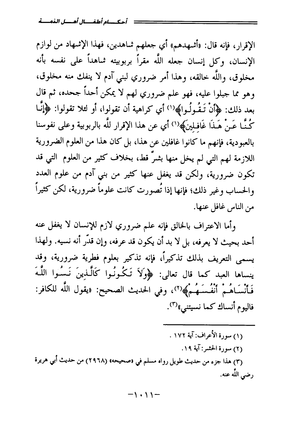 الْإِقْرَارِ، فَإِنَّهُ قَالَ: " أَشْهَدَهُمْ " أَيْ جَعَلَهُمْ شَاهِدِينَ، فَهَذَا الْإِشْهَادُ مِنْ لَوَازِمِ الْإِنْسَانِ، وَكُلُّ إِنْسَانٍ جَعَلَهُ اللَّهُ مُقِرًّا بِرُبُوبِيَّتِهِ شَاهِدًا عَلَى نَفْسِهِ بِأَنَّهُ مَخْلُوقٌ، وَاللَّهَ خَالِقُهُ، وَهَذَا أَمْرٌ ضَرُورِيٌّ لِبَنِي آدَمَ لَا يَنْفِكُّ مِنْهُ مَخْلُوقٌ، وَهُوَ مِمَّا جُبِلُوا عَلَيْهِ، فَهُوَ عِلْمٌ ضَرُورِيٌّ لَهُمْ لَا يُمْكِنُ أَحَدًا جَحْدُهُ، ثُمَّ قَالَ بَعْدَ ذَلِكَ: (أَنْ تَقُولُوا) ، أَيْ كَرَاهِيَةَ أَنْ تَقُولُوا، أَوْ لِئَلَّا تَقُولُوا: {إِنَّا كُنَّا عَنْ هَذَا غَافِلِينَ} [الأعراف: 172] ، أَيْ عَنْ هَذَا الْإِقْرَارِ لِلَّهِ بِالرُّبُوبِيَّةِ، وَعَلَى نُفُوسِنَا بِالْعُبُودِيَّةِ، فَإِنَّهُمْ مَا كَانُوا غَافِلِينَ عَنْ هَذَا، بَلْ كَانَ هَذَا مِنَ الْعُلُومِ الضَّرُورِيَّةِ اللَّازِمَةِ لَهُمُ الَّتِي لَمْ يَخْلُ مِنْهَا بَشَرٌ قَطُّ، بِخِلَافِ كَثِيرٍ مِنَ الْعُلُومِ الَّتِي قَدْ تَكُونُ ضَرُورِيَّةً، وَلَكِنْ قَدْ يَغْفُلُ عَنْهَا كَثِيرٌ مِنْ بَنِي آدَمَ مِنْ عُلُومِ الْعَدَدِ وَالْحِسَابِ وَغَيْرِ ذَلِكَ، فَإِنَّهَا إِذَا تَصَوَّرَتْ كَانَتْ عُلُومًا ضَرُورِيَّةً، لَكِنَّ كَثِيرًا مِنَ النَّاسِ غَافِلٌ عَنْهَا.