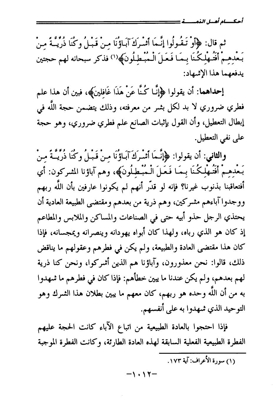 ثُمَّ قَالَ: {أَوْ تَقُولُوا إِنَّمَا أَشْرَكَ آبَاؤُنَا مِنْ قَبْلُ وَكُنَّا ذُرِّيَّةً مِنْ بَعْدِهِمْ أَفَتُهْلِكُنَا بِمَا فَعَلَ الْمُبْطِلُونَ} [الأعراف: 173] ، فَذَكَرَ سُبْحَانَهُ لَهُمْ حُجَّتَيْنِ يَدْفَعُهُمَا هَذَا الْإِشْهَادُ: