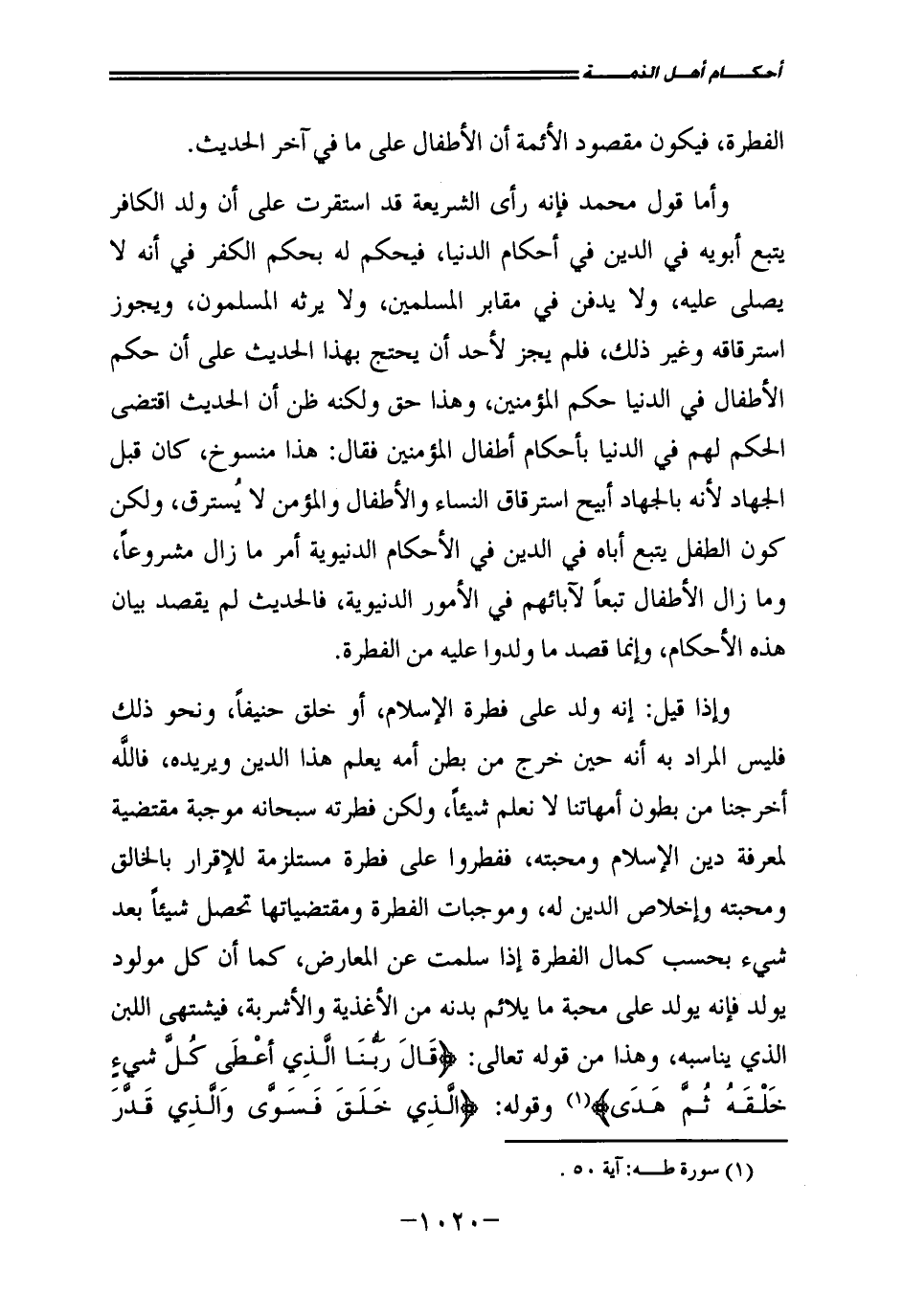 وَأَمَّا قَوْلُ مُحَمَّدٍ فَإِنَّهُ رَأَى الشَّرِيعَةَ قَدِ اسْتَقَرَّتْ عَلَى أَنَّ وَلَدَ الْكَافِرِ يَتْبَعُ أَبَوَيْهِ فِي الدِّينِ فِي أَحْكَامِ الدُّنْيَا، فَيُحْكَمُ لَهُ بِحُكْمِ الْكُفْرِ فِي أَنَّهُ لَا يُصَلَّى عَلَيْهِ، وَلَا يُدْفَنُ فِي مَقَابِرِ الْمُسْلِمِينَ، وَلَا يَرِثُهُ الْمُسْلِمُونَ، وَيَجُوزُ اسْتِرْقَاقُهُ، وَغَيْرُ ذَلِكَ، فَلَمْ يَجُزْ لِأَحَدٍ أَنْ يَحْتَجَّ بِهَذَا الْحَدِيثِ عَلَى أَنَّ حُكْمَ الْأَطْفَالِ فِي الدُّنْيَا حُكْمُ الْمُؤْمِنِينَ، وَهَذَا حَقٌّ وَلَكِنَّهُ ظَنَّ أَنَّ الْحَدِيثَ اقْتَضَى الْحُكْمَ لَهُمْ فِي الدُّنْيَا بِأَحْكَامِ أَطْفَالِ الْمُؤْمِنِينَ، فَقَالَ: هَذَا مَنْسُوخٌ، كَانَ قَبْلَ الْجِهَادِ لِأَنَّهُ بِالْجِهَادِ أُبِيحَ اسْتِرْقَاقُ النِّسَاءِ، وَالْأَطْفَالِ، وَالْمُؤْمِنُ لَا يُسْتَرَقُّ، وَلَكِنْ كَوْنُ الطِّفْلِ يَتْبَعُ أَبَاهُ فِي الدِّينِ فِي الْأَحْكَامِ الدُّنْيَوِيَّةِ أَمْرٌ مَا زَالَ مَشْرُوعًا، وَمَا زَالَ الْأَطْفَالُ تَبَعًا لِآبَائِهِمْ فِي الْأُمُورِ الدُّنْيَوِيَّةِ، فَالْحَدِيثُ لَمْ يَقْصِدْ بَيَانَ هَذِهِ الْأَحْكَامِ، وَإِنَّمَا قَصَدَ مَا وُلِدُوا عَلَيْهِ مِنَ الْفِطْرَةِ.