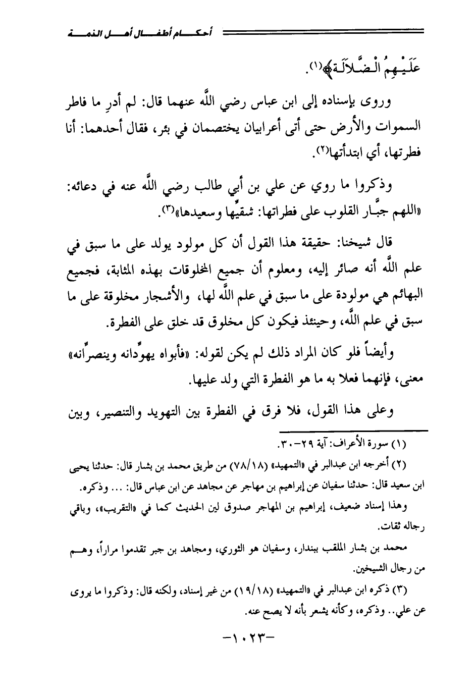 قَالَ شَيْخُنَا: حَقِيقَةُ هَذَا الْقَوْلِ أَنَّ كُلَّ مَوْلُودٍ يُولَدُ عَلَى مَا سَبَقَ فِي عِلْمِ اللَّهِ أَنَّهُ صَائِرٌ إِلَيْهِ، وَمَعْلُومٌ أَنَّ جَمِيعَ الْمَخْلُوقَاتِ بِهَذِهِ الْمَثَابَةِ، فَجَمِيعُ الْبَهَائِمِ هِيَ مَوْلُودَةٌ عَلَى مَا سَبَقَ فِي عِلْمِ اللَّهِ لَهَا، وَالْأَشْجَارُ مَخْلُوقَةٌ عَلَى مَا سَبَقَ فِي عِلْمِ اللَّهِ، وَحِينَئِذٍ فَيَكُونُ كُلُّ مَخْلُوقٍ قَدْ خُلِقَ عَلَى الْفِطْرَةِ.