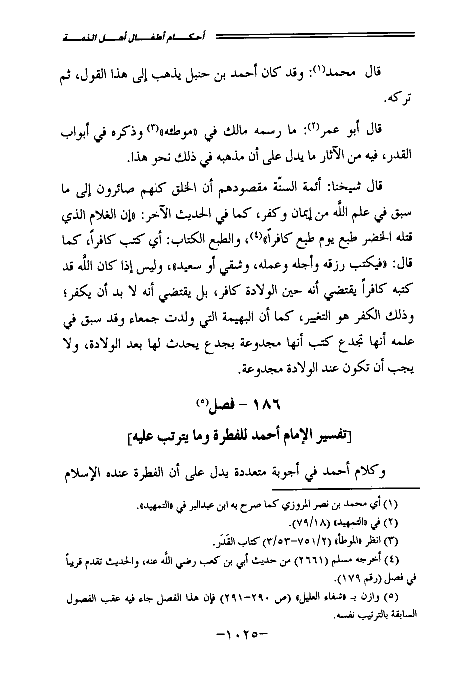 وَكَلَامُ أَحْمَدَ فِي أَجْوِبَةٍ مُتَعَدِّدَةٍ يَدُلُّ عَلَى أَنَّ الْفِطْرَةَ عِنْدَهُ الْإِسْلَامُ