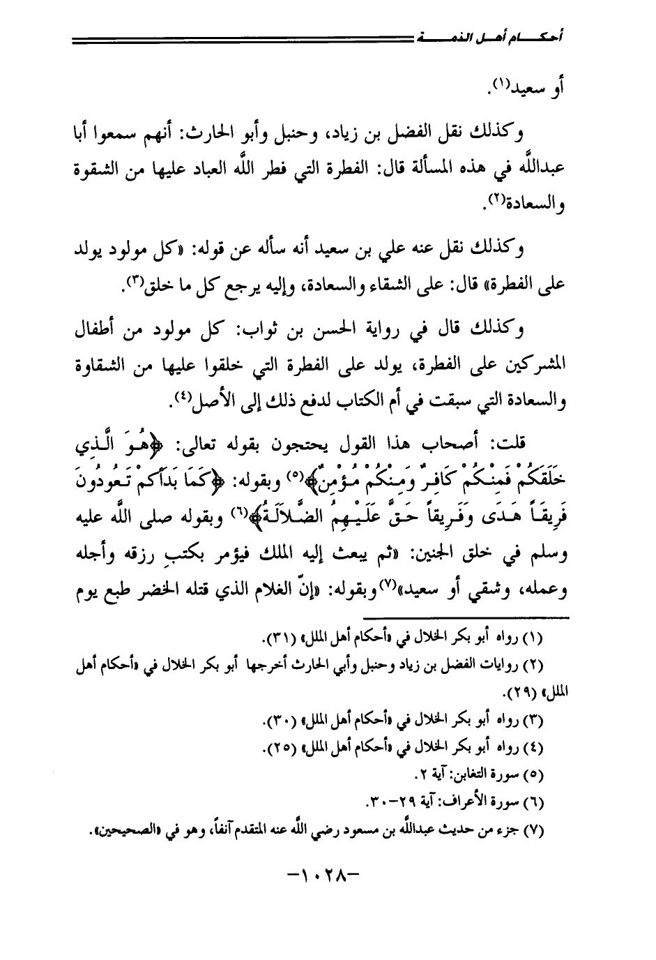 وَكَذَلِكَ نَقَلَ الْفَضْلُ بْنُ زِيَادٍ، وَحَنْبَلٌ، وَأَبُو الْحَارِثِ: أَنَّهُمْ سَمِعُوا أَبَا عَبْدِ اللَّهِ فِي هَذِهِ الْمَسْأَلَةِ قَالَ: الْفِطْرَةُ الَّتِي فَطَرَ اللَّهُ الْعِبَادَ عَلَيْهَا مِنَ الشِّقْوَةِ وَالسَّعَادَةِ.