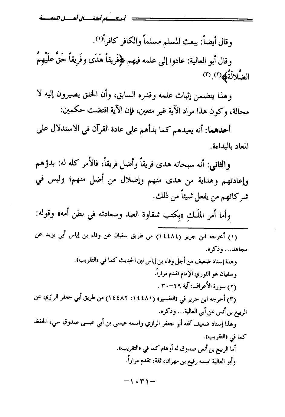 وَقَالَ أَبُو الْعَالِيَةِ: عَادُوا إِلَى عِلْمِهِ فِيهِمْ: {فَرِيقًا هَدَى وَفَرِيقًا حَقَّ عَلَيْهِمُ الضَّلَالَةُ} [الأعراف: 30] .