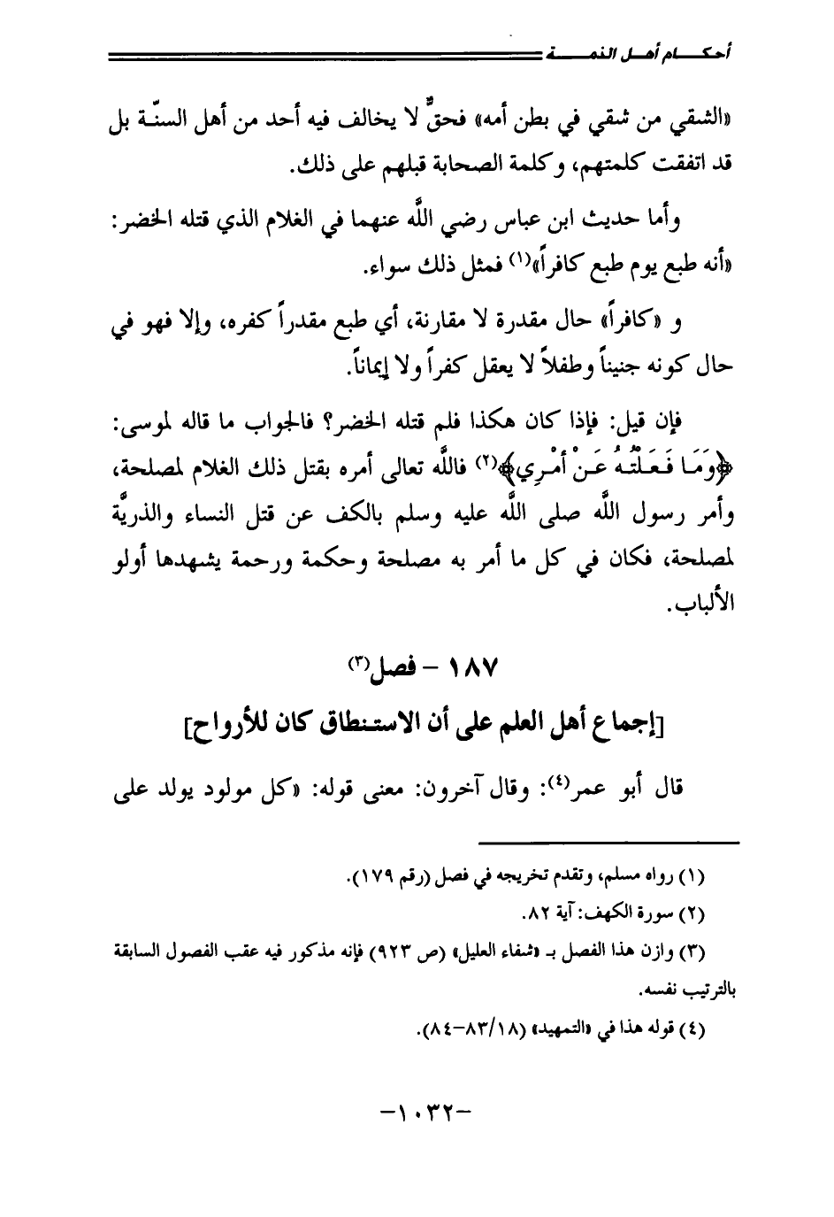 " «الشَّقِيُّ مَنْ شَقِيَ فِي بَطْنِ أُمِّهِ» " فَحَقٌّ لَا يُخَالِفُ فِيهِ أَحَدٌ مِنْ أَهْلِ السُّنَّةِ بَلْ قَدِ اتَّفَقَتْ كَلِمَتُهُمْ، وَكَلِمَةُ الصَّحَابَةِ قَبْلَهُمْ عَلَى ذَلِكَ.