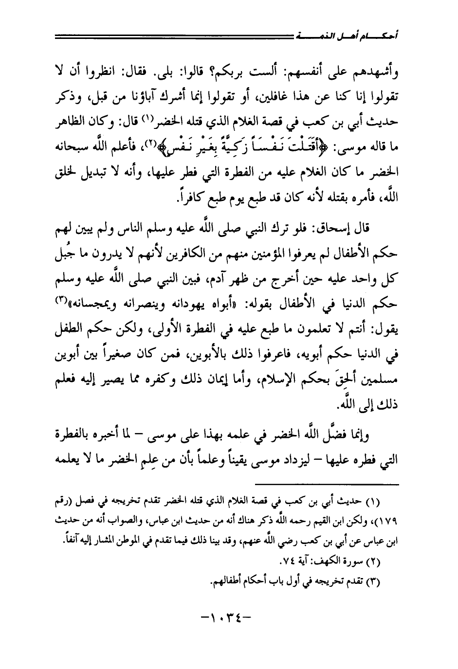 وَأَشْهَدَهُمْ عَلَى أَنْفُسِهِمْ: أَلَسْتُ بِرَبِّكُمْ، قَالُوا: بَلَى، فَقَالَ: انْظُرُوا أَنْ لَا تَقُولُوا إِنَّا كُنَّا عَنْ هَذَا غَافِلِينَ، أَوْ تَقُولُوا إِنَّمَا أَشْرَكَ آبَاؤُنَا مِنْ قَبْلُ، وَذَكَرَ حَدِيثَ أُبَيِّ بْنِ كَعْبٍ فِي قِصَّةِ الْغُلَامِ الَّذِي قَتَلَهُ الْخَضِرُ قَالَ: وَكَانَ الظَّاهِرُ مَا قَالَهُ مُوسَى: {أَقَتَلْتَ نَفْسًا زَكِيَّةً بِغَيْرِ نَفْسٍ} [الكهف: 74] ، فَأَعْلَمَ اللَّهُ سُبْحَانَهُ الْخَضِرَ مَا كَانَ الْغُلَامُ عَلَيْهِ مِنَ الْفِطْرَةِ الَّتِي فُطِرَ عَلَيْهَا، وَأَنَّهُ لَا تَبْدِيلَ لِخَلْقِ اللَّهِ، فَأَمَرَهُ بِقَتْلِهِ لِأَنَّهُ كَانَ قَدْ طُبِعَ يَوْمَ طُبِعَ كَافِرًا.
