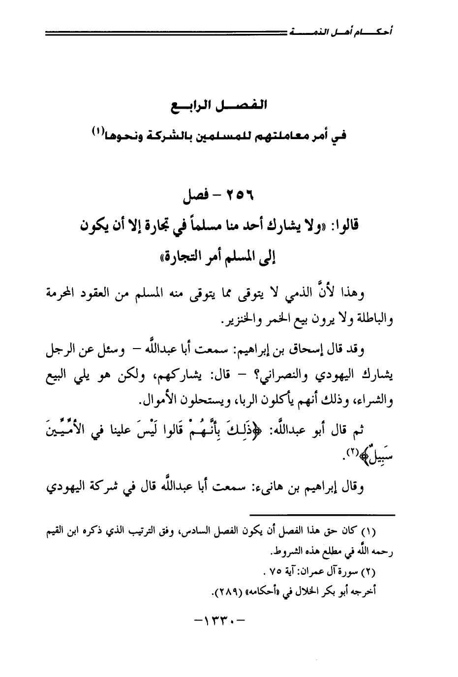 [الْفَصْلُ الرَّابِعُ فِي أَمْرِ مُعَامَلَتِهِمْ لِلْمُسْلِمِينَ بِالشَّرِكَةِ وَنَحْوِهَا] [فَصْلٌ قَولهم وَلَا يُشَارِكُ أَحَدٌ مِنَّا مُسْلِمًا فِي تِجَارَةٍ إِلَّا أَنْ يَكُونَ إِلَى الْمُسْلِمِ أَمْرُ التِّجَارَةِ]