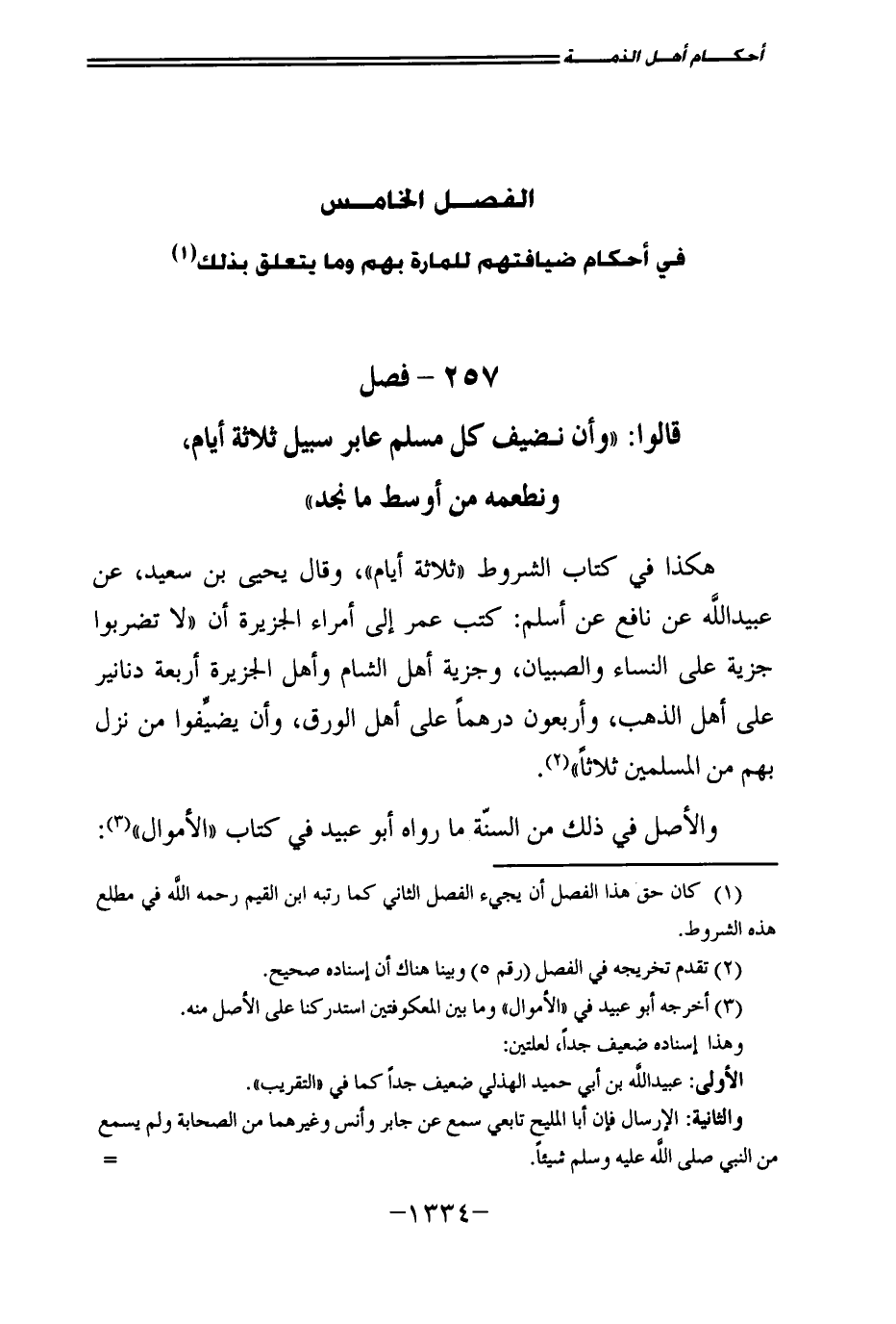 [الْفَصْلُ الْخَامِسُ فِي أَحْكَامِ ضِيَافَتِهِمْ لِلْمَارَّةِ بِهِمْ وَمَا يَتَعَلَّقُ بِذَلِكَ] [فَصْلٌ قَولهم وَأَنْ نُضِيفَ كُلَّ مُسْلِمٍ عَابِرِ سَبِيلٍ ثَلَاثَةَ أَيَّامٍ وَنُطْعِمَهُ مِنْ أَوْسَطِ مَا نَجِدُ]