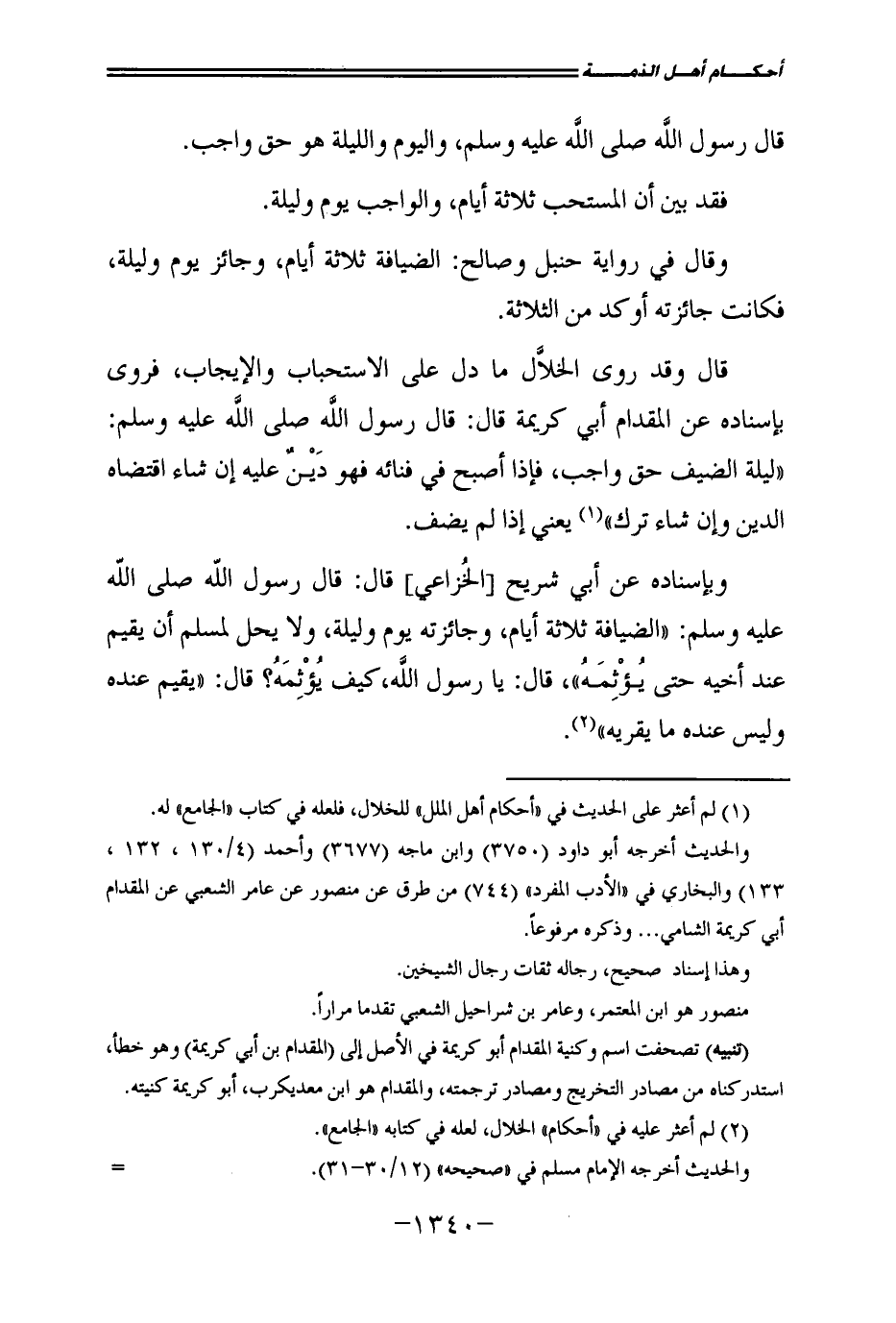 قَالَ: وَقَدْ رَوَى الْخَلَّالُ مَا دَلَّ عَلَى الِاسْتِحْبَابِ وَالْإِيجَابِ، فَرَوَى بِإِسْنَادِهِ عَنِ الْمِقْدَامِ أَبِي كَرِيمَةَ قَالَ: قَالَ رَسُولُ اللَّهِ صَلَّى اللَّهُ عَلَيْهِ وَسَلَّمَ: " «لَيْلَةُ الضَّيْفِ حَقٌّ وَاجِبٌ، فَإِذَا أَصْبَحَ فِي فِنَائِهِ فَهُوَ دَيْنٌ عَلَيْهِ إِنْ شَاءَ اقْتَضَاهُ الدَّيْنَ وَإِنْ شَاءَ تَرَكَ» ". يَعْنِي إِذَا لَمْ يُضِفْ.