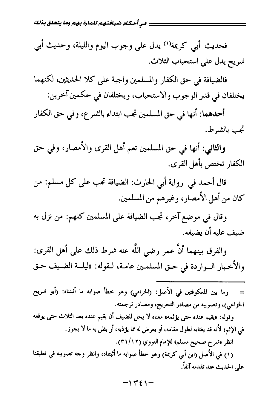 فَحَدِيثُ أَبِي كَرِيمَةَ: يَدُلُّ عَلَى وُجُوبِ الْيَوْمِ وَاللَّيْلَةِ، وَحَدِيثُ أَبِي شُرَيْحٍ يَدُلُّ عَلَى اسْتِحْبَابِ الثَّلَاثِ.