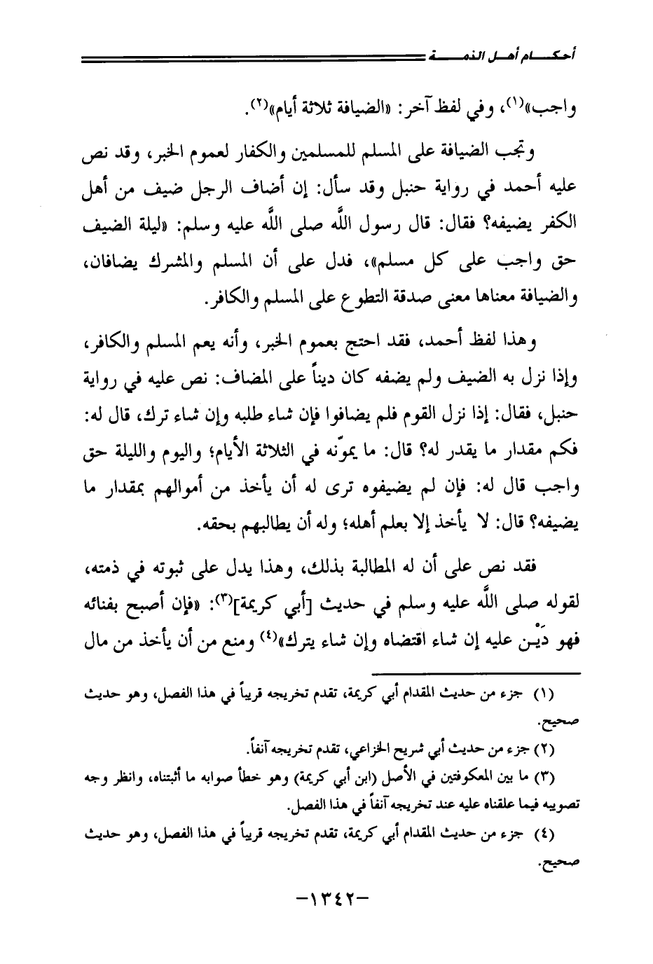 وَهَذَا لَفْظُ أَحْمَدَ، فَقَدِ احْتَجَّ بِعُمُومِ الْخَبَرِ، وَأَنَّهُ يَعُمُّ الْمُسْلِمَ وَالْكَافِرَ، وَإِذَا نَزَلَ بِهِ الضَّيْفُ وَلَمْ يُضِفْهُ كَانَ دَيْنًا عَلَى الْمُضَافِ، نَصَّ عَلَيْهِ فِي رِوَايَةِ حَنْبَلٍ فَقَالَ: إِذَا نَزَلَ الْقَوْمُ فَلَمْ يُضَافُوا فَإِنْ شَاءَ طَلَبَهُ وَإِنْ شَاءَ تَرَكَ، قَالَ لَهُ: فَكَمْ مِقْدَارُ مَا يُقَدَّرُ لَهُ؟ قَالَ: مَا يُمَوِّنُهُ فِي الثَّلَاثَةِ الْأَيَّامِ، وَالْيَوْمُ وَاللَّيْلَةُ حَقٌّ وَاجِبٌ. قَالَ لَهُ: فَإِنْ لَمْ يُضِيفُوهُ تَرَى لَهُ أَنْ يَأْخُذَ مِنْ أَمْوَالِهِمْ بِمِقْدَارِ مَا يُضِيفُهُ؟ قَالَ: لَا يَأْخُذُ إِلَّا بِعِلْمِ أَهْلِهِ، وَلَهُ أَنْ يُطَالِبَهُمْ بِحَقِّهِ.