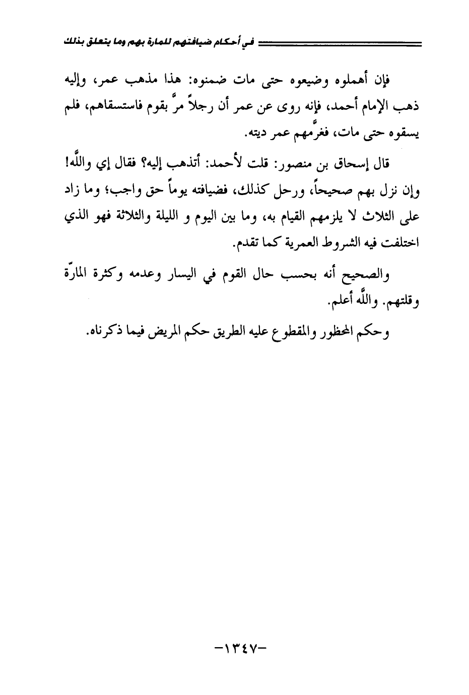 قَالَ إِسْحَاقُ بْنُ مَنْصُورٍ: قُلْتُ لِأَحْمَدَ: أَتَذْهَبُ إِلَيْهِ؟ فَقَالَ: إِي وَاللَّهِ! وَإِنْ نَزَلَ بِهِمْ صَحِيحًا وَرَحَلَ كَذَلِكَ فَضِيَافَتُهُ يَوْمًا حَقٌّ وَاجِبٌ، وَمَا زَادَ عَلَى الثَّلَاثِ لَا يَلْزَمُهُمُ الْقِيَامُ بِهِ، وَمَا بَيْنَ الْيَوْمِ وَاللَّيْلَةِ وَالثَّلَاثَةِ فَهُوَ الَّذِي اخْتَلَفَتْ فِيهِ الشُّرُوطُ الْعُمَرِيَّةُ كَمَا تَقَدَّمَ.