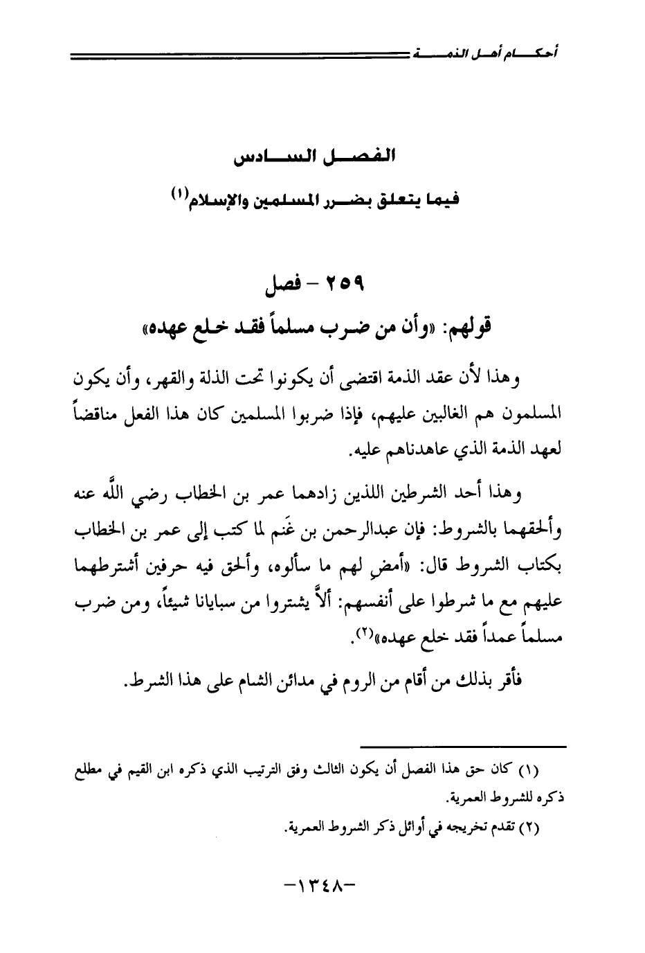 وَهَذَا أَحَدُ الشَّرْطَيْنِ اللَّذَيْنِ زَادَهُمَا عُمَرُ بْنُ الْخَطَّابِ رَضِيَ اللَّهُ عَنْهُ وَأَلْحَقَهُمَا بِالشُّرُوطِ، فَإِنَّ عَبْدَ الرَّحْمَنِ بْنَ غَنْمٍ لَمَّا كَتَبَ إِلَى عُمَرَ بْنِ الْخَطَّابِ بِكِتَابِ الشُّرُوطِ قَالَ: " أَمْضِ لَهُمْ مَا سَأَلُوهُ، وَأَلْحِقْ فِيهِ حَرْفَيْنِ أَشْتَرِطُهُمَا عَلَيْهِمْ مَعَ مَا شَرَطُوا عَلَى أَنْفُسِهِمْ: أَلَّا يَشْتَرُوا مِنْ سَبَايَانَا شَيْئًا، وَمَنْ ضَرَبَ مُسْلِمًا عَمْدًا فَقَدْ خَلَعَ عَهْدَهُ ".