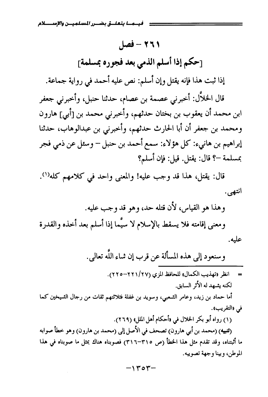 قَالَ الْخَلَّالُ: أَخْبَرَنِي عِصْمَةُ بْنُ عِصَامٍ، حَدَّثَنَا حَنْبَلٌ، وَأَخْبَرَنِي جَعْفَرُ بْنُ مُحَمَّدٍ أَنَّ يَعْقُوبَ بْنَ بُخْتَانَ حَدَّثَهُمْ، وَأَخْبَرَنِي مُحَمَّدُ بْنُ [أَبِي] هَارُونَ وَمُحَمَّدُ بْنُ جَعْفَرٍ أَنَّ أَبَا الْحَارِثِ حَدَّثَهُمْ، وَأَخْبَرَنِي ابْنُ عَبْدِ الْوَهَّابِ، حَدَّثَنَا إِبْرَاهِيمُ بْنُ هَانِئٍ: كُلُّ هَؤُلَاءِ سَمِعَ أَحْمَدَ بْنَ حَنْبَلٍ - وَسُئِلَ عَنْ ذِمِّيٍّ فَجَرَ بِمُسْلِمَةٍ -؟ قَالَ: يُقْتَلُ. قِيلَ: فَإِنْ أَسْلَمَ؟ قَالَ: يُقْتَلُ، هَذَا قَدْ وَجَبَ عَلَيْهِ! وَالْمَعْنَى وَاحِدٌ فِي كَلَامِهِمْ كُلِّهِ، انْتَهَى.