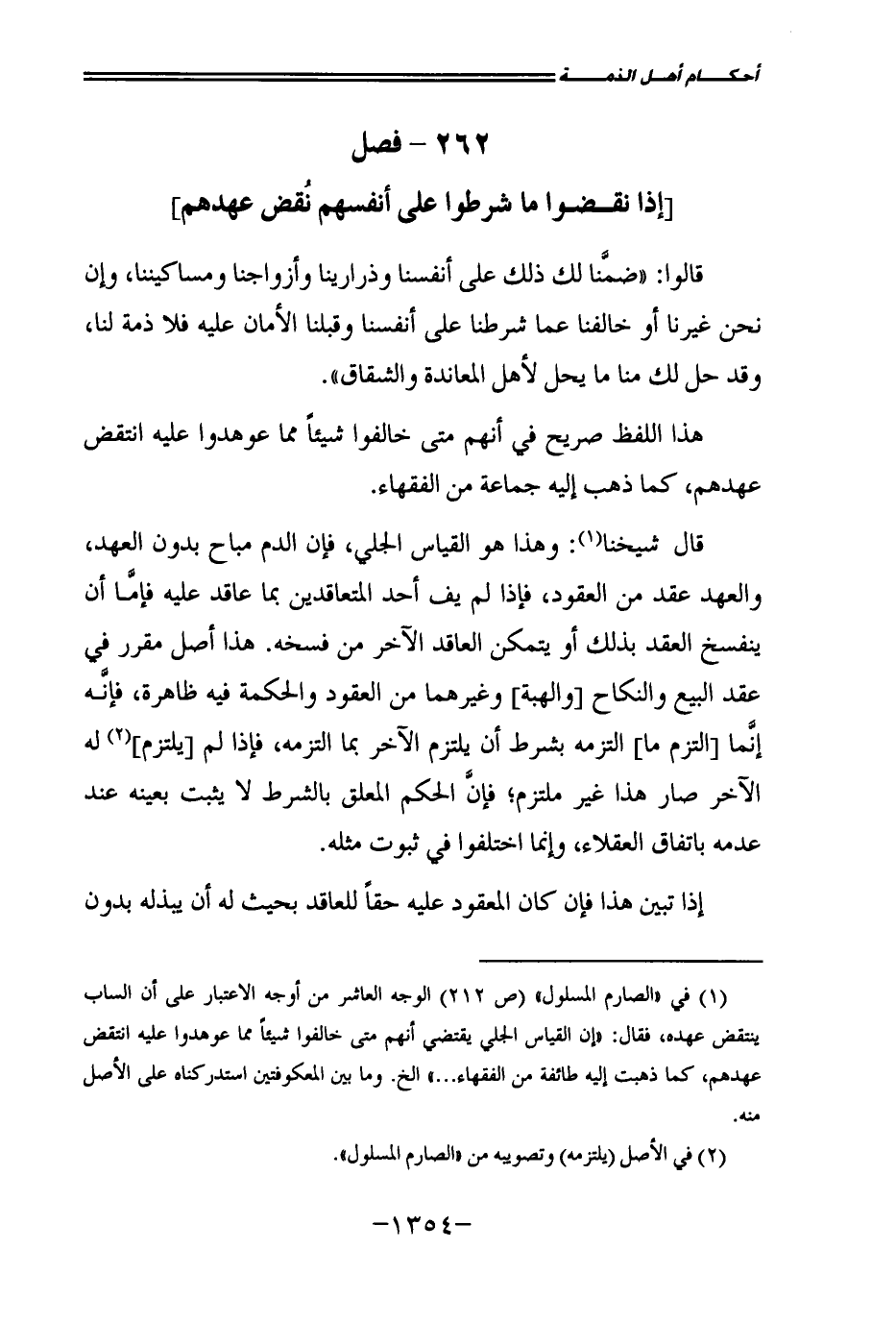 قَالَ شَيْخُنَا: وَهَذَا هُوَ الْقِيَاسُ الْجَلِيُّ، فَإِنَّ الدَّمَ مُبَاحٌ بِدُونِ الْعَهْدِ، وَالْعَهْدُ عَقْدٌ مِنَ الْعُقُودِ، فَإِذَا لَمْ يَفِ أَحَدُ الْمُتَعَاقِدَيْنِ بِمَا عَاقَدَ عَلَيْهِ فَإِمَّا أَنْ يَنْفَسِخَ الْعَقْدُ بِذَلِكَ أَوْ يَتَمَكَّنَ الْعَاقِدُ الْآخَرُ مِنْ فَسْخِهِ، هَذَا أَصْلٌ مُقَرَّرٌ فِي عَقْدِ الْبَيْعِ وَالنِّكَاحِ [وَالْهِبَةِ] وَغَيْرِهِمَا مِنَ الْعُقُودِ، وَالْحِكْمَةُ فِيهِ ظَاهِرَةٌ، فَإِنَّهُ إِنَّمَا [الْتَزَمَ مَا] الْتَزَمَهُ بِشَرْطِ أَنْ يَلْتَزِمَ الْآخَرُ بِمَا الْتَزَمَهُ، فَإِذَا لَمْ [يَلْتَزِمْ] لَهُ الْآخَرُ صَارَ هَذَا غَيْرَ مُلْتَزِمٍ، فَإِنَّ الْحُكْمَ الْمُعَلَّقَ بِالشَّرْطِ لَا يَثْبُتُ بِعَيْنِهِ عِنْدَ عَدَمِهِ بِاتِّفَاقِ الْعُقَلَاءِ، وَإِنَّمَا اخْتَلَفُوا فِي ثُبُوتِ مِثْلِهِ.