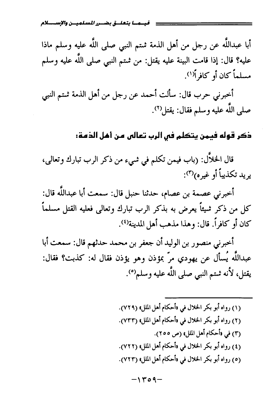 أَخْبَرَنِي عِصْمَةُ بْنُ عِصَامٍ، حَدَّثَنَا حَنْبَلٌ قَالَ: سَمِعْتُ أَبَا عَبْدِ اللَّهِ قَالَ: كُلُّ مَنْ ذَكَرَ شَيْئًا يَعْرِضُ بِهِ بِذِكْرِ الرَّبِّ تَبَارَكَ وَتَعَالَى فَعَلَيْهِ الْقَتْلُ مُسْلِمًا كَانَ أَوْ كَافِرًا. قَالَ: وَهَذَا مَذْهَبُ أَهْلِ الْمَدِينَةِ.