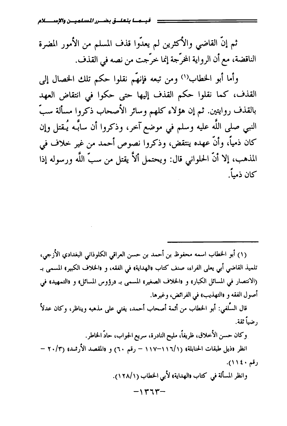 وَأَمَّا أَبُو الْخَطَّابِ وَمَنْ تَبِعَهُ فَإِنَّهُمْ نَقَلُوا حُكْمَ تِلْكَ الْخِصَالِ إِلَى الْقَذْفِ، كَمَا نَقَلُوا حُكْمَ الْقَذْفِ إِلَيْهَا حَتَّى حَكَوْا فِي انْتِقَاضِ الْعَهْدِ بِالْقَذْفِ رِوَايَتَيْنِ، ثُمَّ إِنَّ هَؤُلَاءِ كُلَّهُمْ وَسَائِرَ الْأَصْحَابِ ذَكَرُوا مَسْأَلَةَ سَبِّ النَّبِيِّ صَلَّى اللَّهُ عَلَيْهِ وَسَلَّمَ فِي مَوْضِعٍ آخَرَ، وَذَكَرُوا أَنَّ سَابَّهُ يُقْتَلُ وَإِنْ كَانَ ذِمِّيًّا، وَأَنَّ عَهْدَهُ يُنْتَقَضُ، وَذَكَرُوا نُصُوصَ أَحْمَدَ مِنْ غَيْرِ خِلَافٍ فِي الْمَذْهَبِ إِلَّا أَنَّ الْحُلْوَانِيَّ قَالَ: وَيَحْتَمِلُ أَلَّا يُقْتَلَ مَنْ سَبَّ اللَّهَ وَرَسُولَهُ إِذَا كَانَ ذِمِّيًّا.