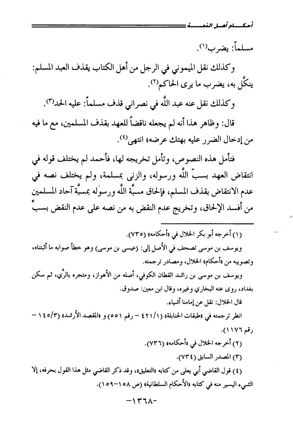 وَكَذَلِكَ نَقَلَ الْمَيْمُونِيُّ فِي الرَّجُلِ مِنْ أَهْلِ الْكِتَابِ يَقْذِفُ الْعَبْدَ الْمُسْلِمَ: يُنَكَّلُ بِهِ، يُضْرَبُ مَا يَرَى الْحَاكِمُ.
