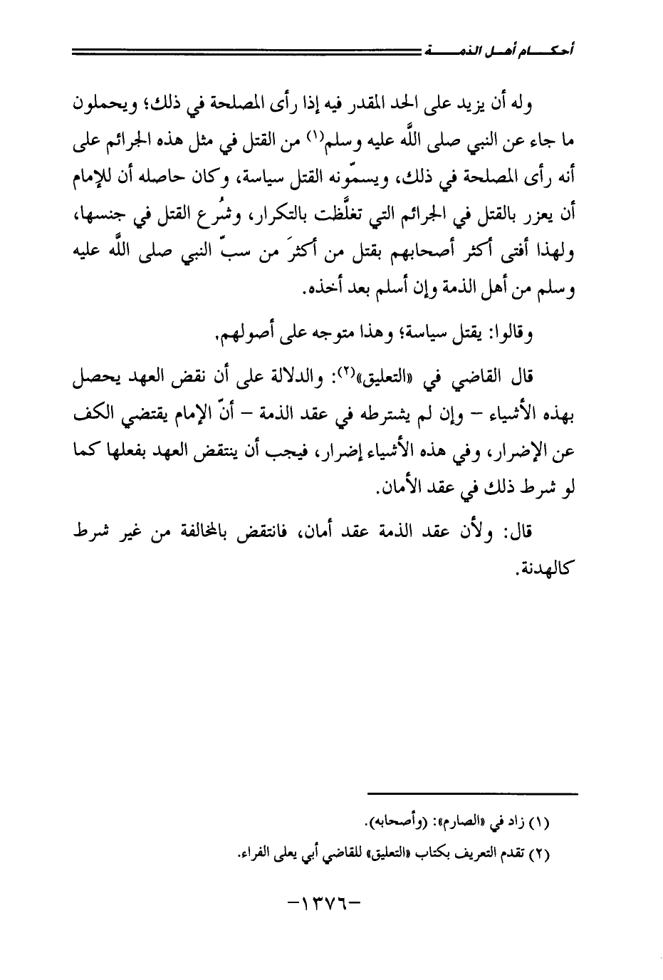 وَلَهُ أَنْ يَزِيدَ عَلَى الْحَدِّ الْمُقَدَّرِ فِيهِ إِذَا رَأَى الْمَصْلَحَةَ فِي ذَلِكَ، وَيَحْمِلُونَ مَا جَاءَ عَنِ النَّبِيِّ صَلَّى اللَّهُ عَلَيْهِ وَسَلَّمَ مِنَ الْقَتْلِ فِي مِثْلِ هَذِهِ الْجَرَائِمِ عَلَى أَنَّهُ رَأَى الْمَصْلَحَةَ فِي ذَلِكَ وَيُسَمُّونَهُ الْقَتْلَ سِيَاسَةً، وَكَانَ حَاصِلُهُ أَنَّ لِلْإِمَامِ أَنْ يُعَزِّرَ بِالْقَتْلِ فِي الْجَرَائِمِ الَّتِي تَغَلَّظَتْ بِالتَّكْرَارِ، وَشُرِعَ الْقَتْلُ فِي جِنْسِهَا، وَلِهَذَا أَفْتَى أَكْثَرُ أَصْحَابِهِمْ بِقَتْلِ مَنْ أَكْثَرَ مِنْ سَبِّ النَّبِيِّ صَلَّى اللَّهُ عَلَيْهِ وَسَلَّمَ مِنْ أَهْلِ الذِّمَّةِ وَإِنْ أَسْلَمَ بَعْدَ أَخْذِهِ.