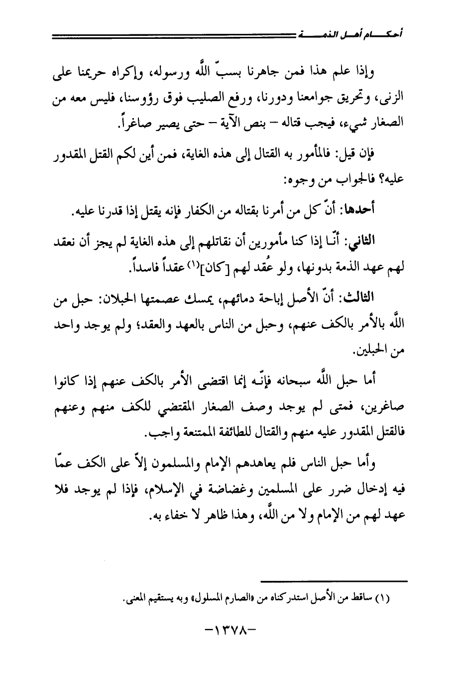 أَمَّا حَبْلُ اللَّهِ سُبْحَانَهُ فَإِنَّهُ إِنَّمَا اقْتَضَى الْأَمْرَ بِالْكَفِّ عَنْهُمْ إِذَا كَانُوا صَاغِرِينَ، فَمَتَى لَمْ يُوجَدُ وَصْفُ الصَّغَارِ الْمُقْتَضِي لِلْكَفِّ مِنْهُمْ وَعَنْهُمْ، فَالْقَتْلُ الْمَقْدُورُ عَلَيْهِ مِنْهُمْ وَالْقِتَالُ لِلطَّائِفَةِ الْمُمْتَنِعَةِ وَاجِبٌ.