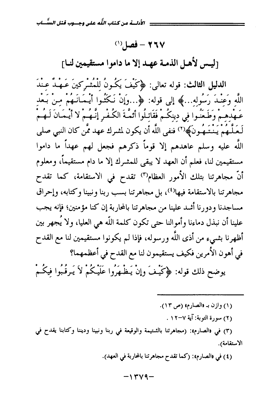 الدَّلِيلُ الثَّالِثُ: قَوْلُهُ تَعَالَى: {كَيْفَ يَكُونُ لِلْمُشْرِكِينَ عَهْدٌ عِنْدَ اللَّهِ وَعِنْدَ رَسُولِهِ} [التوبة: 7] إِلَى قَوْلِهِ: {وَإِنْ نَكَثُوا أَيْمَانَهُمْ مِنْ بَعْدِ عَهْدِهِمْ وَطَعَنُوا فِي دِينِكُمْ فَقَاتِلُوا أَئِمَّةَ الْكُفْرِ إِنَّهُمْ لَا أَيْمَانَ لَهُمْ لَعَلَّهُمْ يَنْتَهُونَ} [التوبة: 12] فَنَفَى اللَّهُ أَنْ يَكُونَ لِمُشْرِكٍ عَهْدٌ مِمَّنْ كَانَ النَّبِيُّ صَلَّى اللَّهُ عَلَيْهِ وَسَلَّمَ عَاهَدَهُمْ إِلَّا قَوْمًا ذَكَرَهُمْ فَجَعَلَ لَهُمْ عَهْدًا مَا دَامُوا مُسْتَقِيمِينَ لَنَا، فَعُلِمَ أَنَّ الْعَهْدَ لَا يَبْقَى لِلْمُشْرِكِ إِلَّا مَا دَامَ مُسْتَقِيمًا، وَمَعْلُومٌ أَنَّ مُجَاهَرَتَنَا بِتِلْكَ الْأُمُورِ الْعِظَامِ تَقْدَحُ فِي الِاسْتِقَامَةِ كَمَا تَقْدَحُ مُجَاهَرَتُنَا بِالِاسْتِقَامَةِ فِيهَا، بَلْ مُجَاهَرَتُنَا بِسَبِّ رَبِّنَا وَنَبِيِّنَا وَكِتَابِهِ وَإِحْرَاقِ مَسَاجِدِنَا وَدُورِنَا أَشَدُّ عَلَيْنَا مِنْ مُجَاهَرَتِنَا بِالْمُحَارَبَةِ إِنْ كُنَّا مُؤْمِنِينَ فَإِنَّهُ يَجِبُ عَلَيْنَا أَنْ نَبْذُلَ دِمَاءَنَا وَأَمْوَالَنَا حَتَّى تَكُونَ كَلِمَةُ اللَّهِ هِيَ الْعُلْيَا وَلَا يُجْهَرَ بَيْنَ أَظْهُرِنَا بِشَيْءٍ مِنْ أَذَى اللَّهِ وَرَسُولِهِ، فَإِذَا لَمْ يَكُونُوا مُسْتَقِيمِينَ لَنَا مَعَ الْقَدْحِ فِي أَهْوَنِ الْأَمْرَيْنِ فَكَيْفَ يَسْتَقِيمُونَ لَنَا مَعَ الْقَدْحِ فِي أَعْظَمِهِمَا؟