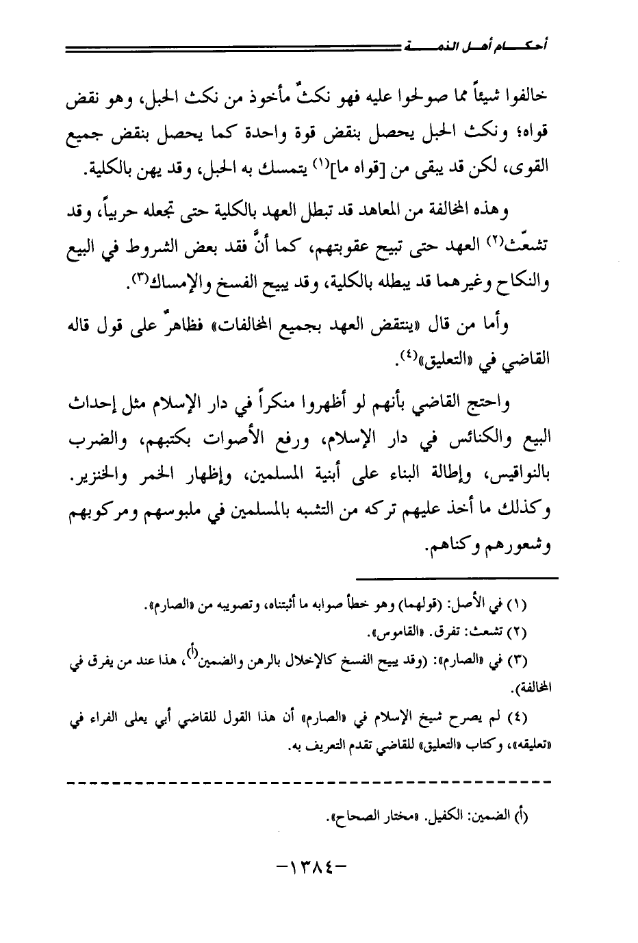 وَاحْتَجَّ الْقَاضِي بِأَنَّهُمْ لَوْ أَظْهَرُوا مُنْكَرًا فِي دَارِ الْإِسْلَامِ مِثْلَ: إِحْدَاثِ الْبِيَعِ وَالْكَنَائِسِ فِي دَارِ الْإِسْلَامِ وَرَفْعِ الْأَصْوَاتِ بِكُتُبِهِمْ وَالضَّرْبِ بِالنَّوَاقِيسِ وَإِطَالَةِ الْبِنَاءِ عَلَى أَبْنِيَةِ الْمُسْلِمِينَ وَإِظْهَارِ الْخَمْرِ وَالْخِنْزِيرِ، وَكَذَلِكَ مَا أُخِذَ عَلَيْهِمْ تَرْكُهُ مِنَ التَّشَبُّهِ بِالْمُسْلِمِينَ فِي مَلْبُوسِهِمْ وَمَرْكُوبِهِمْ وَشُعُورِهِمْ وَكُنَاهُمْ.